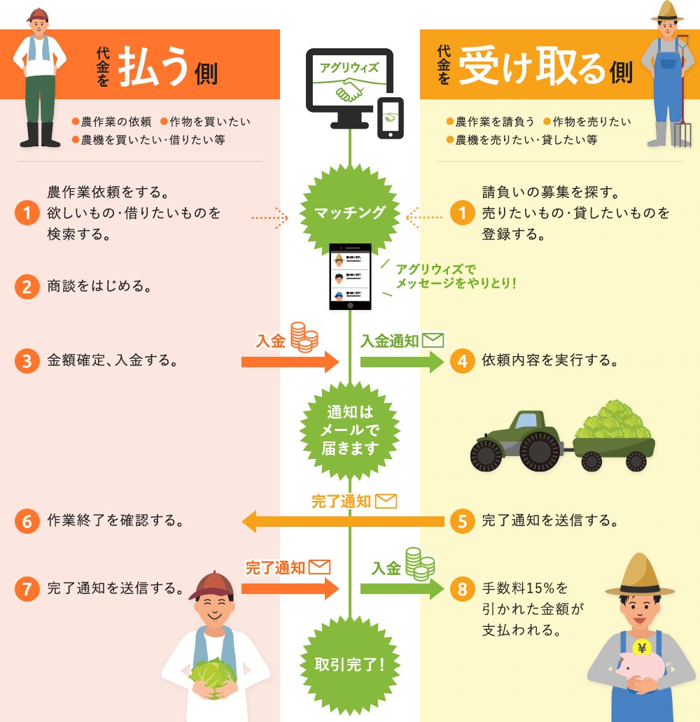 会員同士が農業に関する困りごと(農作業の依頼、作物の販路拡大、農機を借りたい等)や、できることを互いに助け合えるマッチングWebサービス。