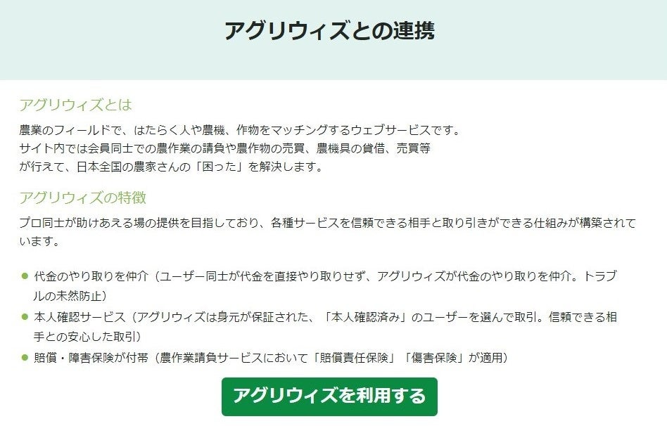今後、『農How®』を利用している会員ユーザーは、連携ボタンを押すだけで『アグリウィズ』の登録が自動で記入されます。相互のサービス利用がシームレスで可能となり、さらなるマッチングの機会を創出する事が可能となりました。