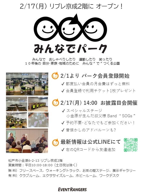 2025年2月17日、株式会社イベント・レンジャーズ(本社:東京都港区芝2‐29-10、代表取締役:松宮洋昌)は、株式会社京成ストア(本社:千葉県市川市市川3‐30‐1、代表取締役社長:東原光陽)を共創パートナーに迎え、地域コミュニティ拠点 ”みんなでパーク” の1号店をリブレ京成小金原店の2階にオープンいたします。高齢化が進む地域において、あたらしいスタイルのコミュニティづくりの場を提供することにより、「いくつになっても人生を謳歌できる」「楽しく自然と健康づくりができる」「継続的に地域で助け合える」地域社会づくりに寄与し、【人生100年時代を楽しむ社会】の実現を目指してまいります。