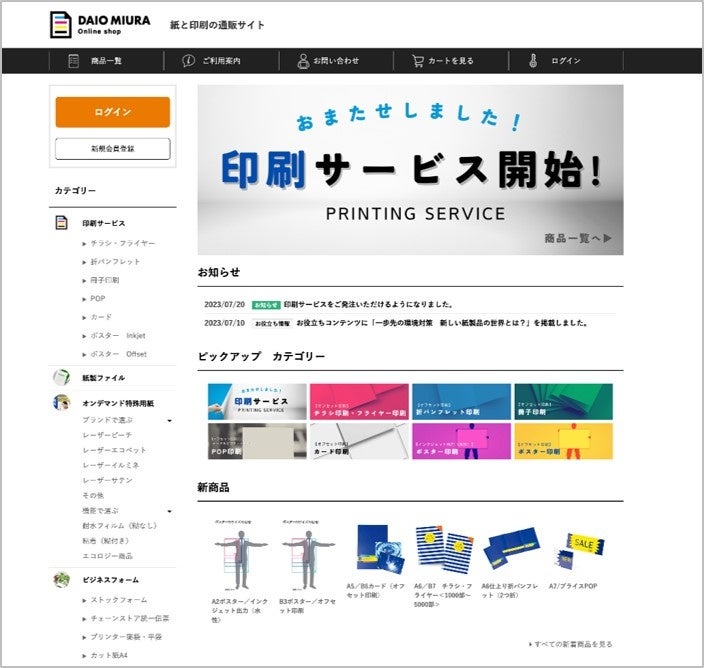 ダイオーミウラオンラインショップでは、紙製品の販売や小部数の印刷の受託に加え、今後は簡易な「デザイン制作」や「WEB制作」など、制作業務を一括受託できる体制を整えてまいります。また、ダイオーミウラの生産拠点を活用した「大ロット生産」、印刷と配布をセットした「折り込みチラシサービス」など、企業の販売促進をトータルで支援するサービスをラインナップしていく計画です。