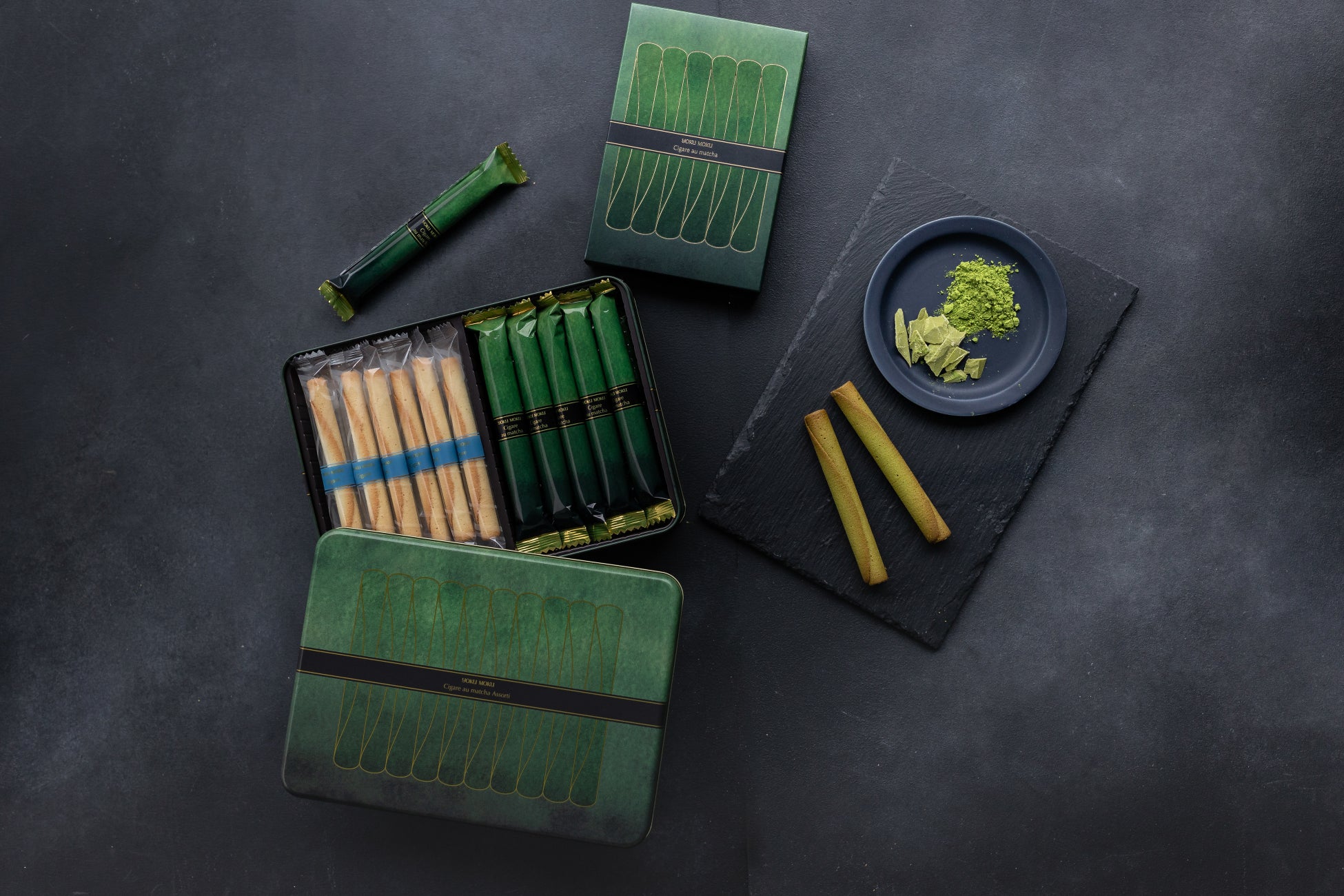 昨年リニューアルしたパッケージは、「シガール オゥ マッチャ」を並べた姿をモチーフに、美味しさの余韻に深く浸っていただきたいという想いから、深みのある緑や、抹茶本来の素材感を感じられるような色合いにしました。
