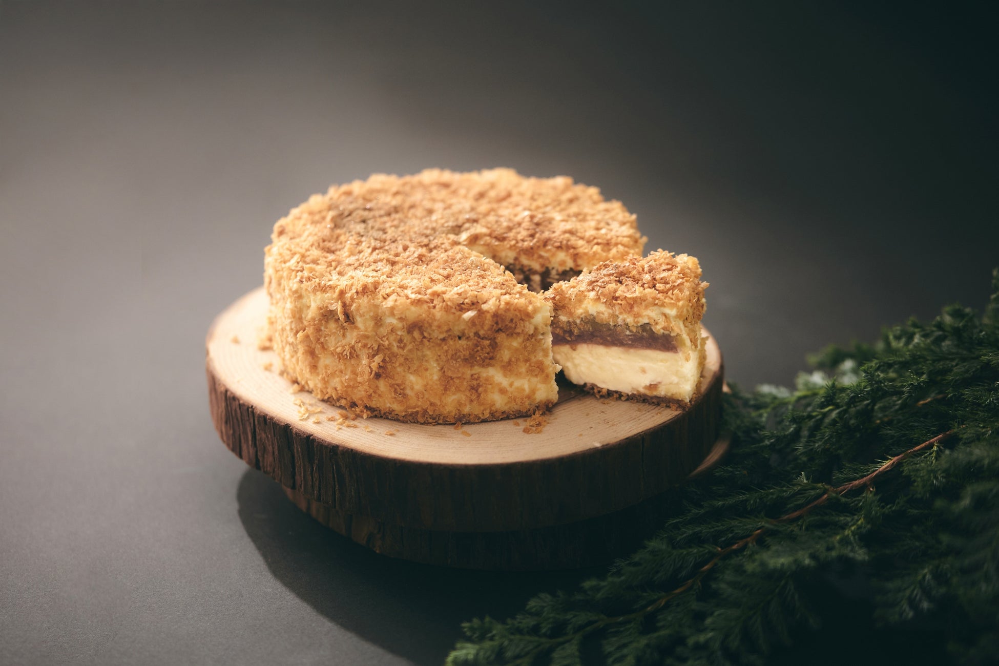 濃厚なベイクドチーズケーキに、爽やかなライム香るレアチーズを重ねた贅沢な二層仕立て。 中にはリュバーブのコンポートをそっと忍ばせ、口に広がる酸味とチーズのコクが絶妙に調和します。 仕上げに香ばしいフイユタージュのクラムを纏わせ、食感と風味にアクセントを加えた、クリスマスの特別なひとときを彩る上品なチーズケーキです。