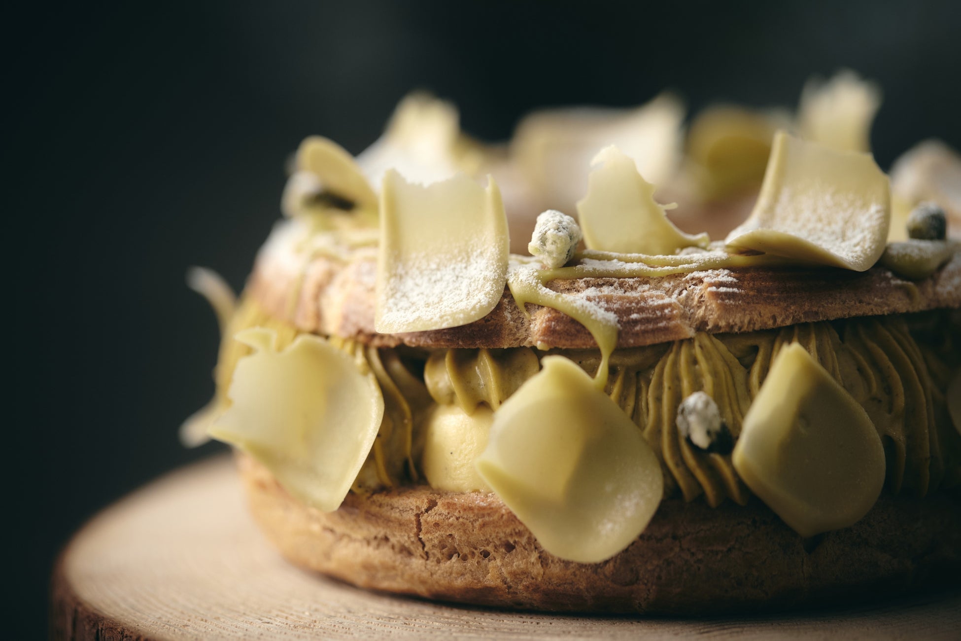香ばしく焼き上げたリング状のシューに、甘酸っぱいグリオットチェリーのクリームとコンポート、蜂蜜とバニラを効かせたクレームブリュレを重ねました。 濃厚なピスタチオクリームをたっぷり絞り、ピスタチオ風味のフォンダンとホワイトチョコレートで華やかに仕上げています。