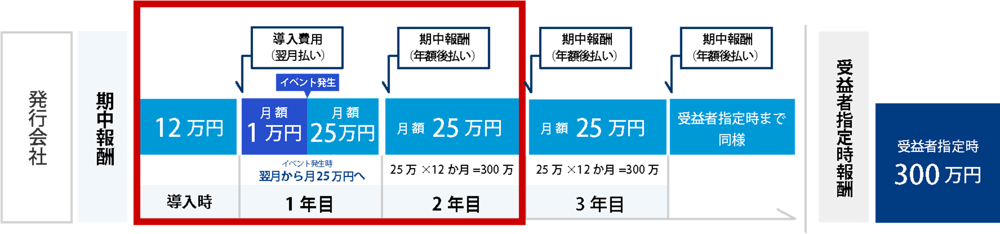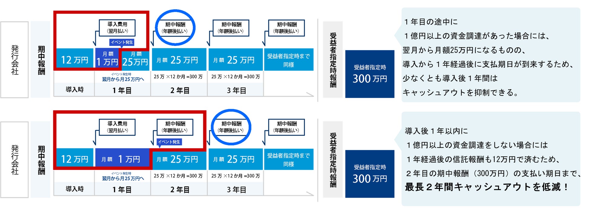 ※※創業者支援プランは、「設立後2年以内の企業であり、設立時を含み、導入時までに調達した資本性資金の合計額(新株予約権や転換社債を活用したエクイティファイナンスを含みます。)と累計連結売上高のいずれも1億円を超えない企業」を対象としております。但し、1年目に累計1億円以上のエクイティファイナンスがある場合には、翌月から月額25万円になります。資金調達が導入後1年以内に完了しない場合には導入から1年間の信託報酬としては、導入時報酬12万円と1年目の期中報酬12万円の合計24万円のみが掛かることになり、2年目の期中報酬の支払い時期が到来するまでの1年間と加えて、導入後2年間を資金調達や事業推進の期間として確保することができます。(税抜表示です)