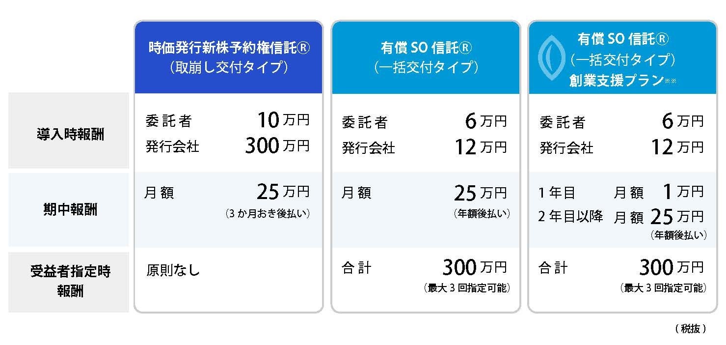 そこで、当社は、今般、受益者指定のオペレーション等が急に発⽣しないであろうと考えられるシード期のスタートアップ企業向けに、時価発行新株予約権信託®(一括交付タイプ)を、新たに導⼊コストを下げて信託報酬の発⽣時期を後ろ倒しにすることで、シード期のスタートアップ企業にとっても導⼊しやすい形にリパッケージし、「有償SO信託®︎」として提供を再開することといたしました。