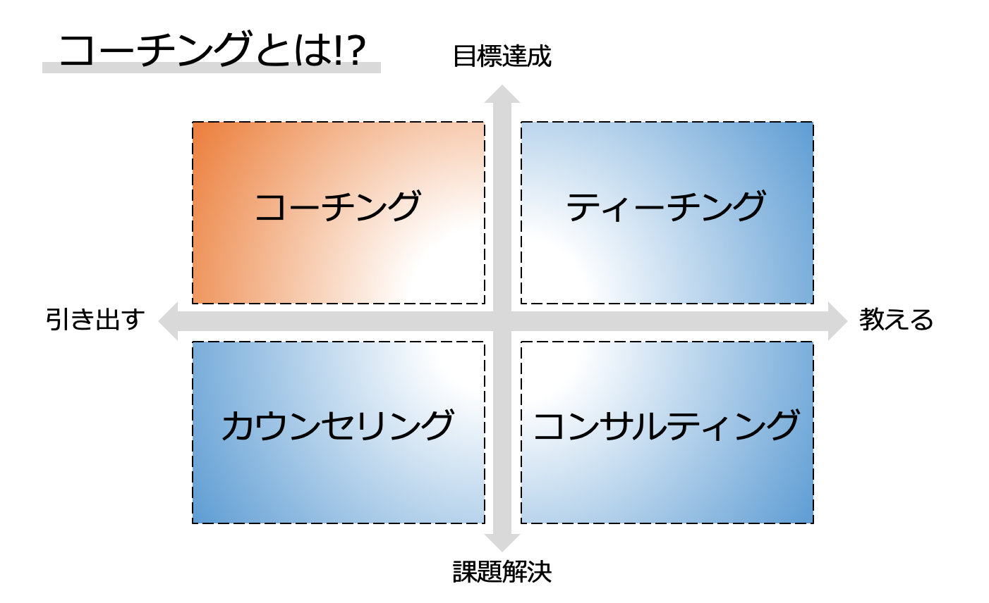 コーチングとは、単に知識やスキルを教える「ティーチング」とは異なり、目標の達成や成長志向を持つクライアントがコーチとの対話や問いかけを通じて課題や解決法を明らかにすることで、"自発的な行動による成長を促す”ためのプログラムです。