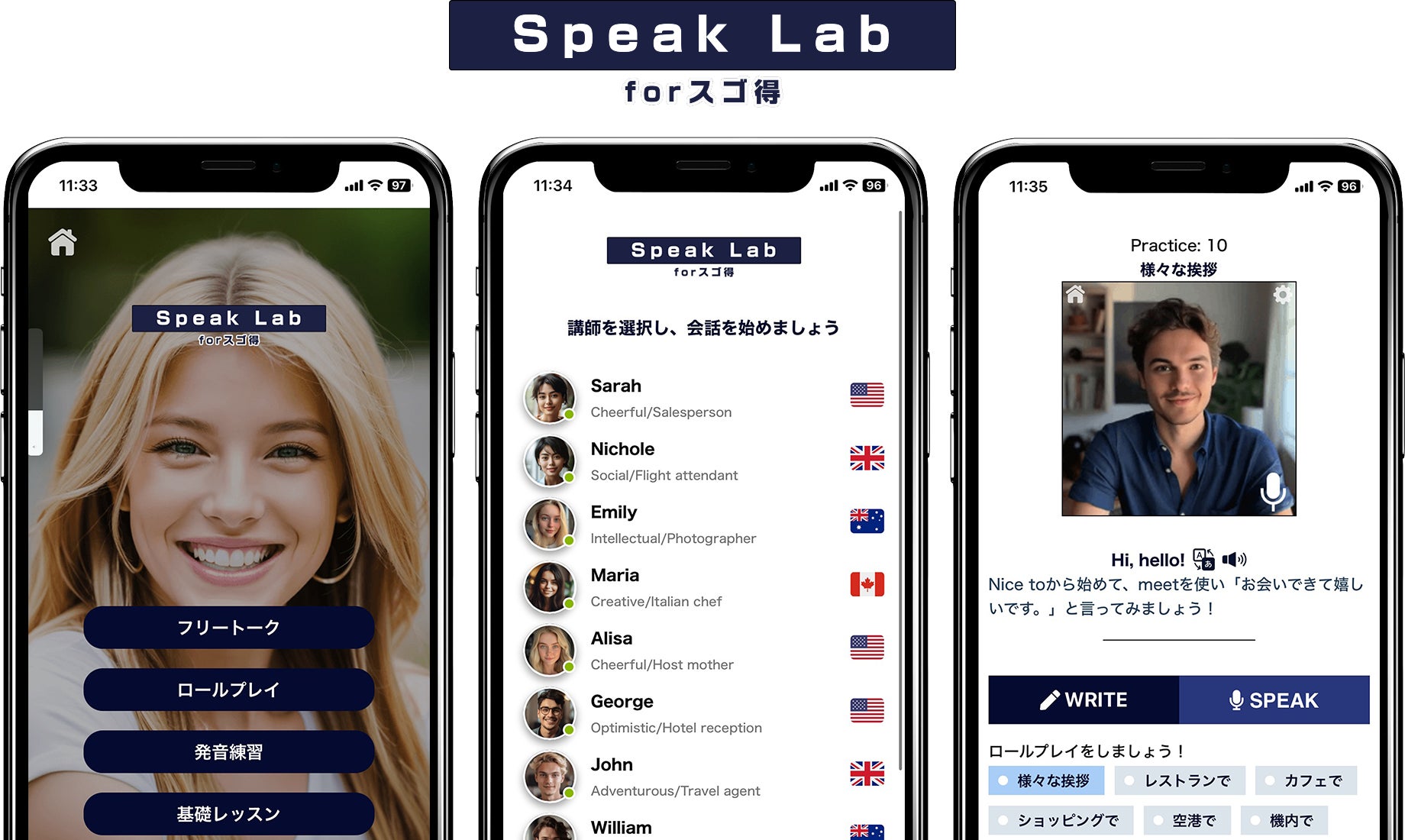 『Speak Lab forスゴ得』は、株式会社アルタビスタライズ(本社:東京都世田谷区、代表取締役:小澤英治)と共同で開発したAI英会話サービスです。AIが相手となるため間違えることを恐れず、24時間365日楽しみながら英会話を習得できます。