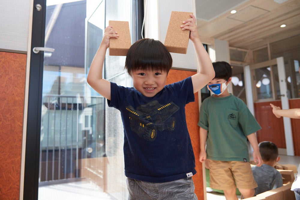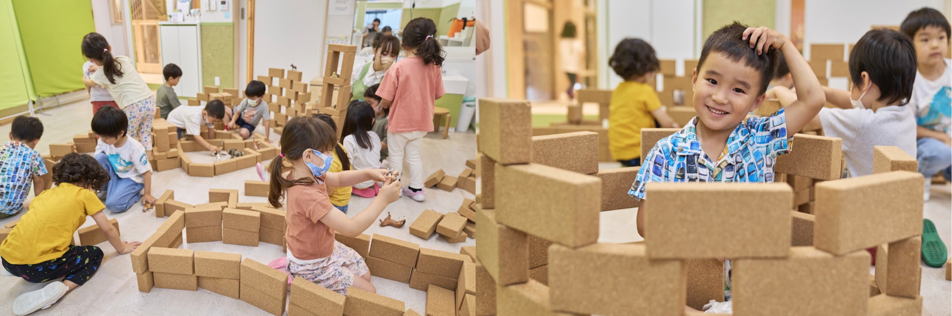 「保育園としてSDGsで何ができるのかなと考えたときに、廃棄されるコルクが再生された積み木を永続的に使っていくという着眼点において、当社の取り組みと合致していると感じます。自然を感じるナチュラルな色だからこそ、子どもが自由に色まで想像して作っています。従来の積み木より大きいため、大胆な発想に広がり、今まで思いもつかなかった遊びに繋がっていますね。角がなく安全なので、保育者としては安心な要素の一つです。発見が多くて、私たちとしても刺激を受けることが多く楽しいです」