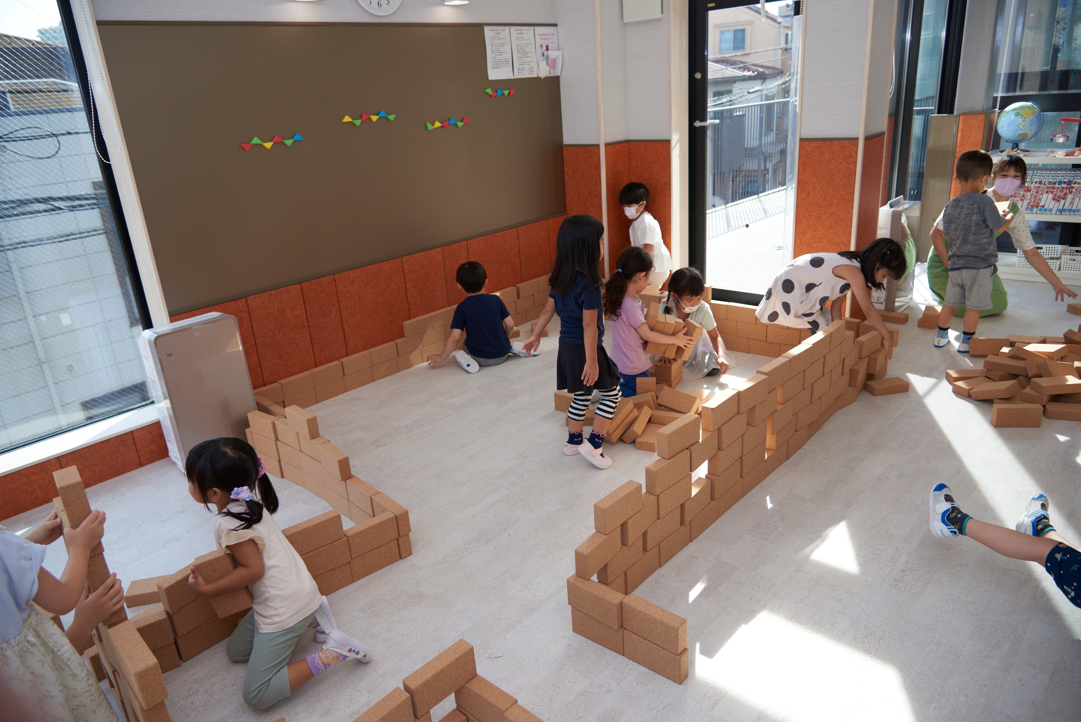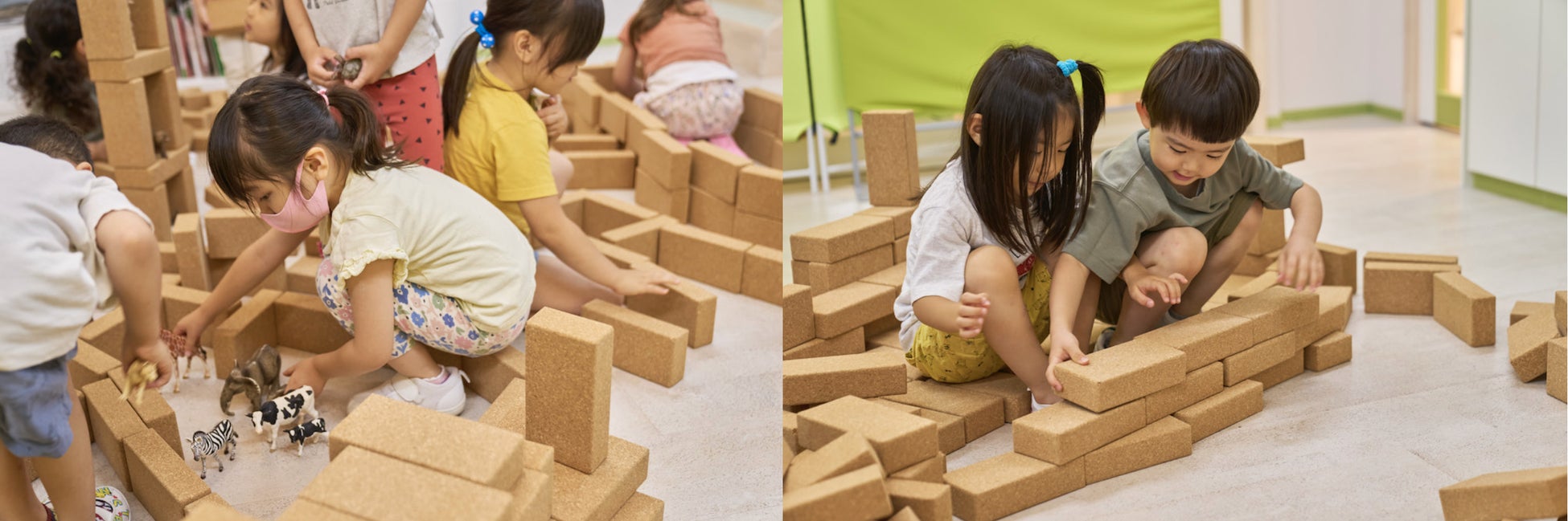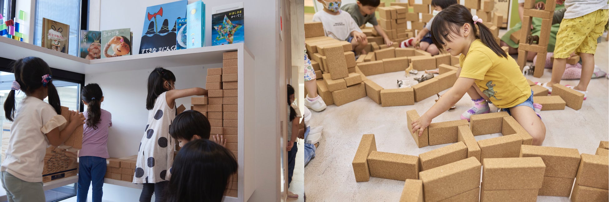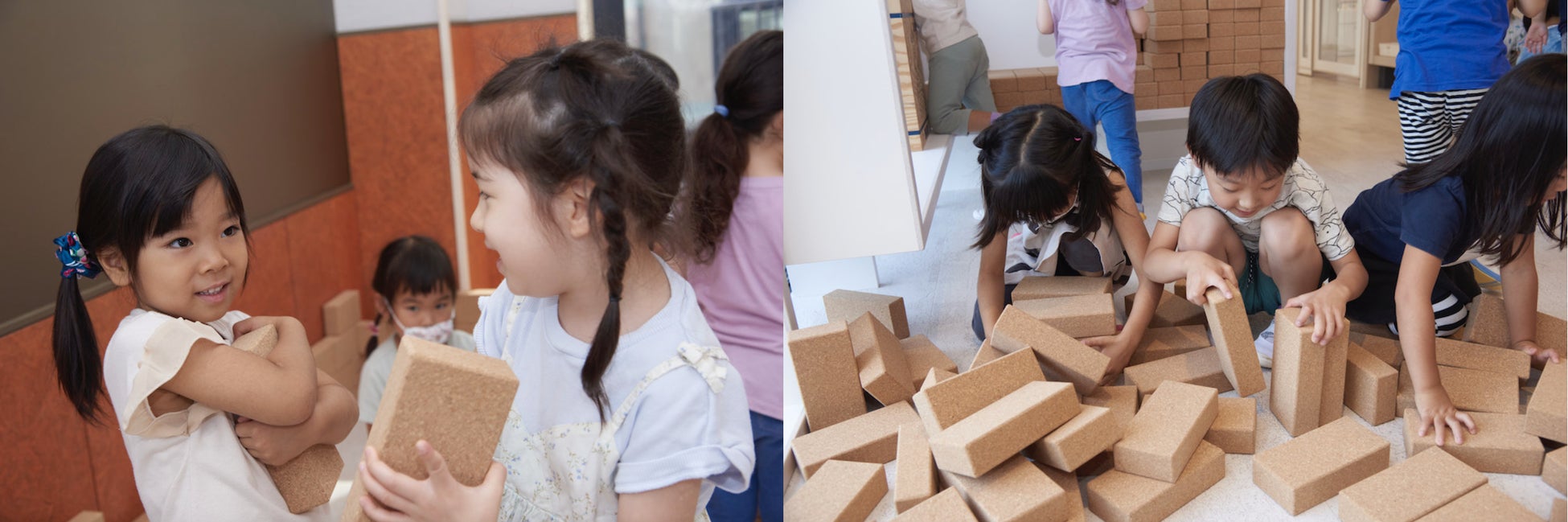 コルクは天然素材で、断熱・遮音・防水・弾力・軽量・絶縁性など多くの機能特性があります。安全性が重要視される保育現場におきましては、「軽くて丈夫、かつ安全に遊べる」玩具として需要を見込みこの度導入していただきました。たった一つの長方形のカタチが子どもたちの想像力をかきたて、また従来の積み木の倍以上の大きさにも関わらず軽さを兼ね備えているため、何個も持ち運び大きな基地が出来上がるなど、保育現場では、個々から集団あそびにも繋がる様子が伺えます。