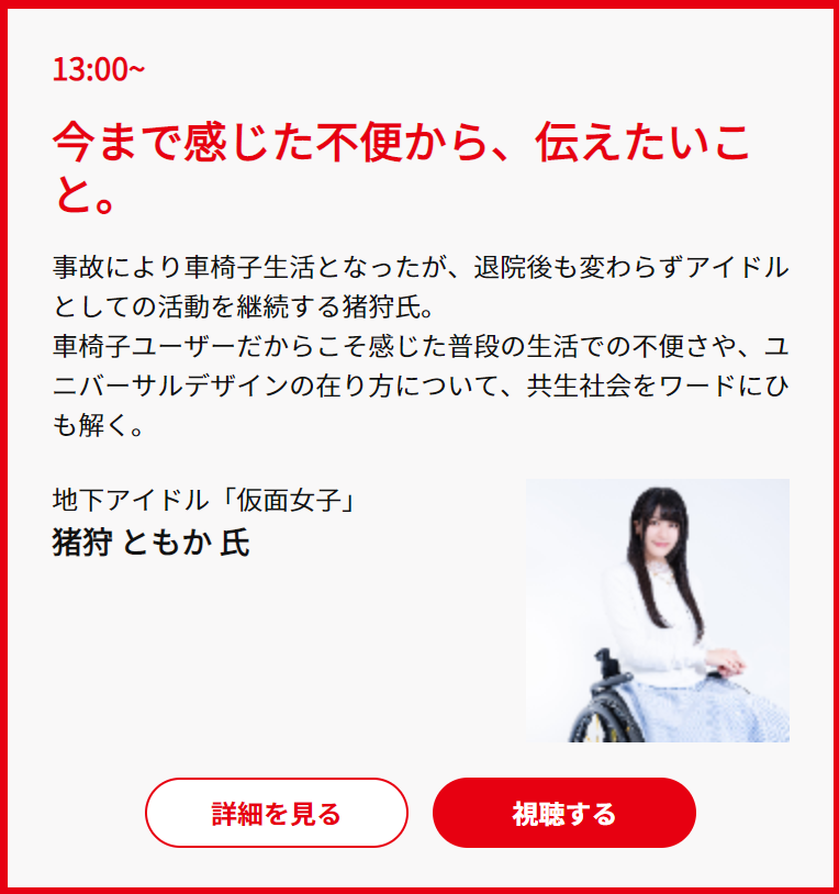 アイドル活動や日常生活を送るなかで、ライブ会場やホテルなど様々な場面で猪狩氏が直面した弊害について、実体験をもとに、五体満足だった頃には気づくことのなかった障壁や改善点、そして誰もが暮らしやすい環境を作る大切さについてお話します。そのほか、車椅子生活を行っている人々が普段どのように生活しているのか、健常者が考えるバリアフリーやユニバーサルデザインの考え方との乖離についてなど、「共生社会」の考え方について理解を深められる内容となっています。