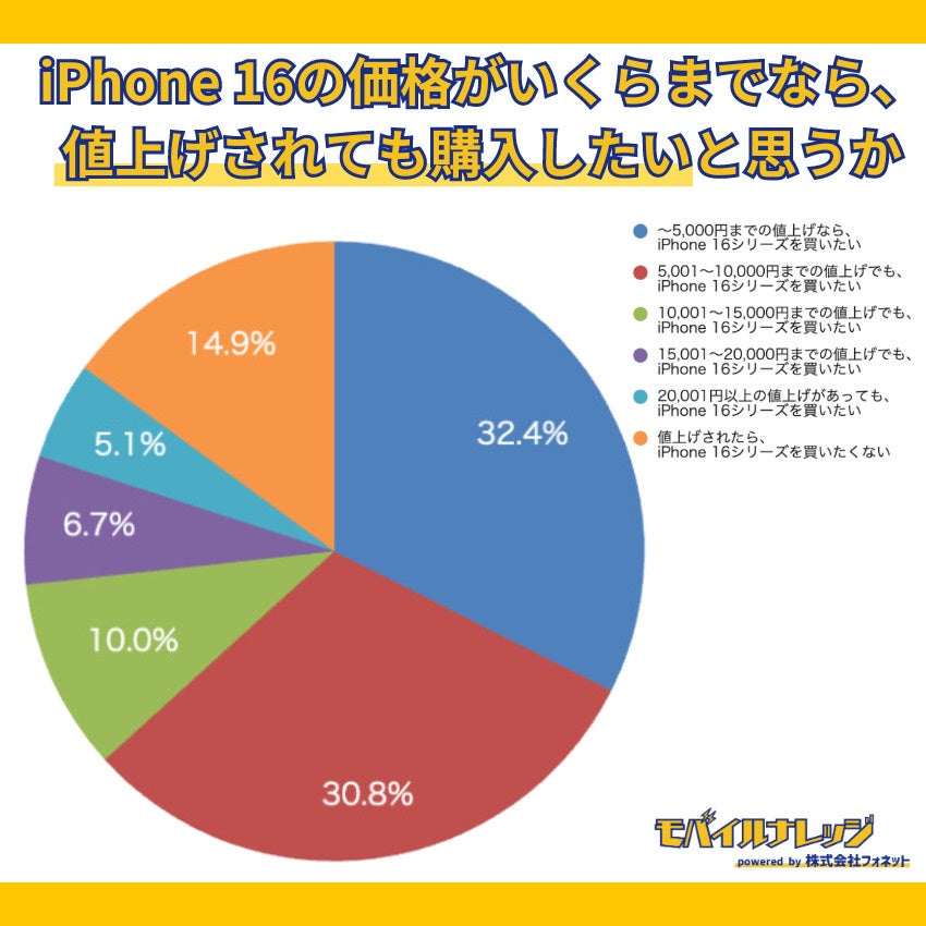 iPhone 16シリーズは、値上げが5,000円までなら購入したい人が32.4% 値下げ後にiPhone 15シリーズを購入予定の人は55.3%【モバイルナレッジが調査】