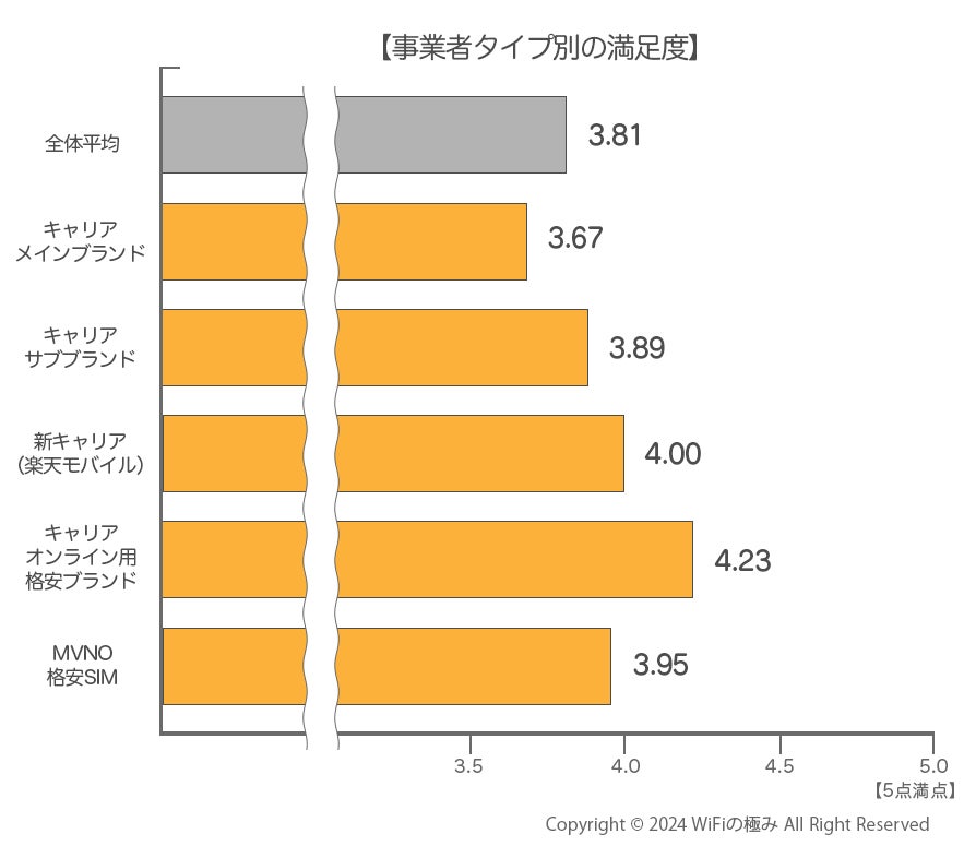 満足度はキャリアのオンライン用格安ブランドが最も高く、キャリアのメインブランドが最も低い