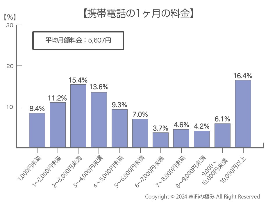 1ヶ月の携帯電話料金は平均5,607円。2,000〜4,000円程度の分布が多くなっている一方で、10,000円以上という人も多数います。