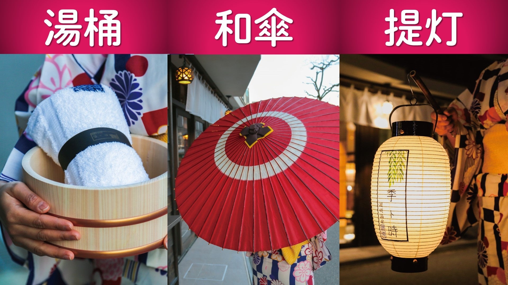 浴衣と下駄に身を包み、街や湯めぐりを楽しむ「そぞろ歩き」は城崎温泉の魅力です。「城崎温泉の、これからの楽しみ方」をコンセプトにする季ト時は、さらに「湯桶」「和傘」「提灯」の3つを加えて、贅沢気分に浸れるそぞろ歩きサービスを7/5から開始しました。