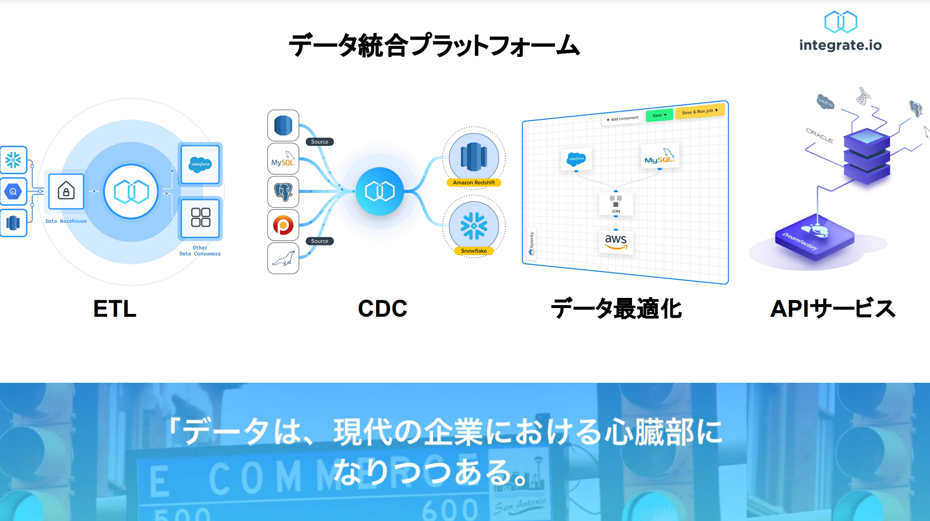 日本人が米国で創業したFlyDataを昨年12月に買収することで、Integrate.ioのポートフォリオに加わりました。彼らの技術により、データをデータウェアハウスにレプリケーションし、お客様のチームやシステムがほぼリアルタイムでデータを活用できるようにします。