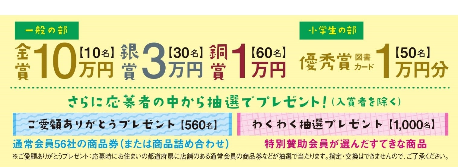 | さらに!応募者全員(入賞者を除く)の中から抽選でプレゼント! 「ご愛顧ありがとうプレゼント」(560名) 通常会員56社の商品券(または商品詰め合わせ)をプレゼント! 「わくわく抽選プレゼント」 (1,000名) 特別賛助会員が選んだ、すてきな商品をプレゼント! |