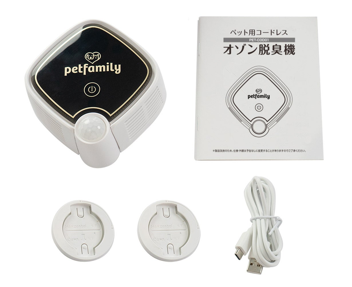 本製品はペットのトイレ等、ニオイが気になる場所へ設置すると短時間で嫌なニオイを脱臭する『ペット用コードレスオゾン脱臭機』です。