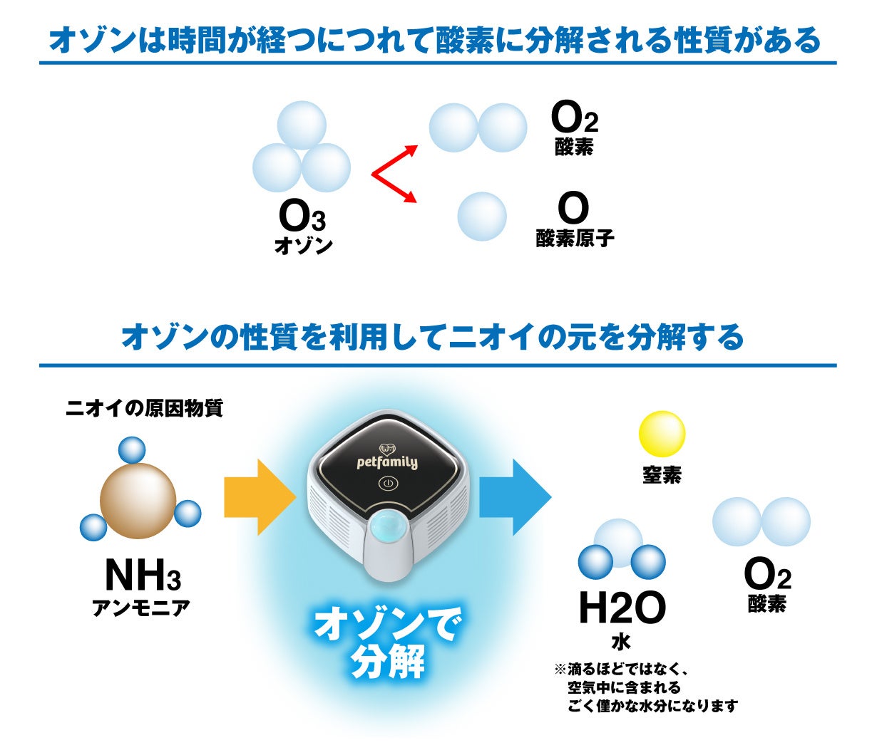 そのため本製品は交換フィルター要らず、余計なニオイでごまかすこともない、環境とペットと人に優しい商品となっております。これらの技術でコンパクトかつ、強力な消臭力を実現しています。