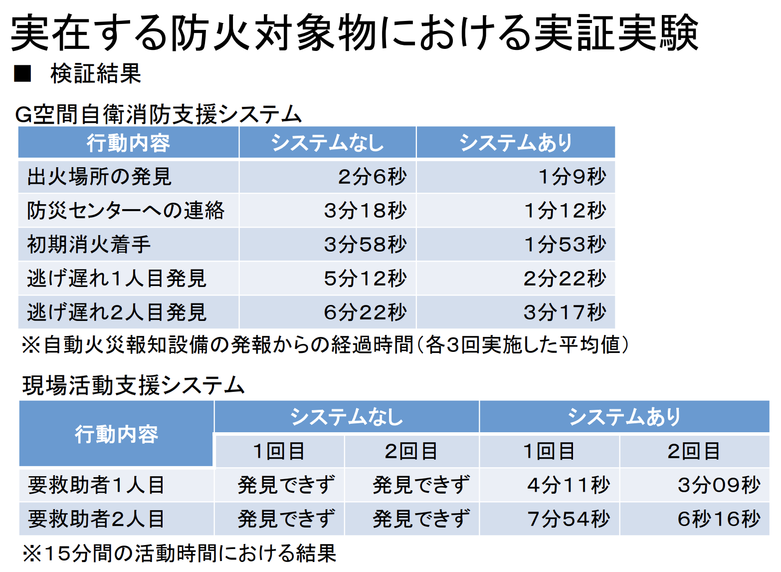 本研究開発成果として、防火対象物全体の安全性を向上させる「G空間情報消防活動支援システム」を開発し、実在する防火対象物における実証実験では、G空間自衛消防支援システム、現場活動支援システム(スマートマスク)の両システムともに大きな改善がみられました。