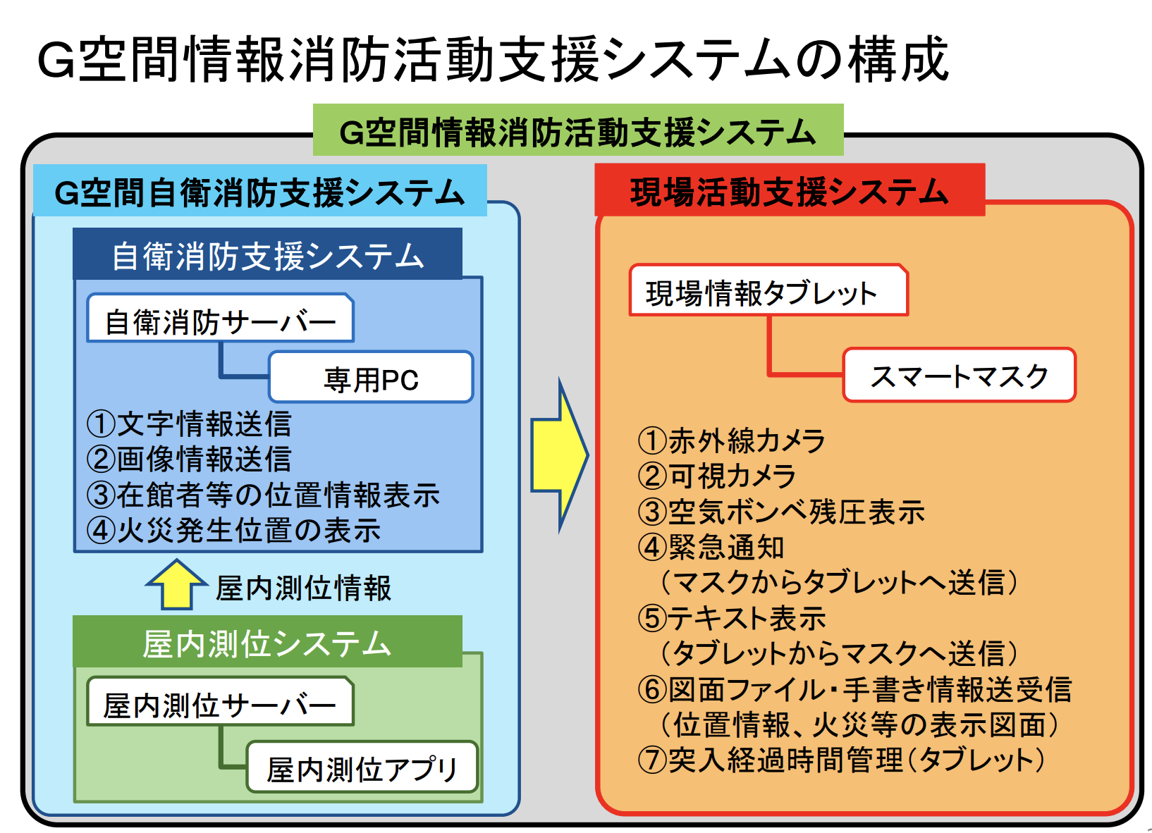 赤外線カメラやディスプレイ等を付加し多機能化を図ったスマートマスクと通信機能を付加したタブレットにより構成され、現場の消防隊員と後方の指揮者(隊長・現場指揮本部)間で情報(カメラ映像等)を共有することができるシステム。
