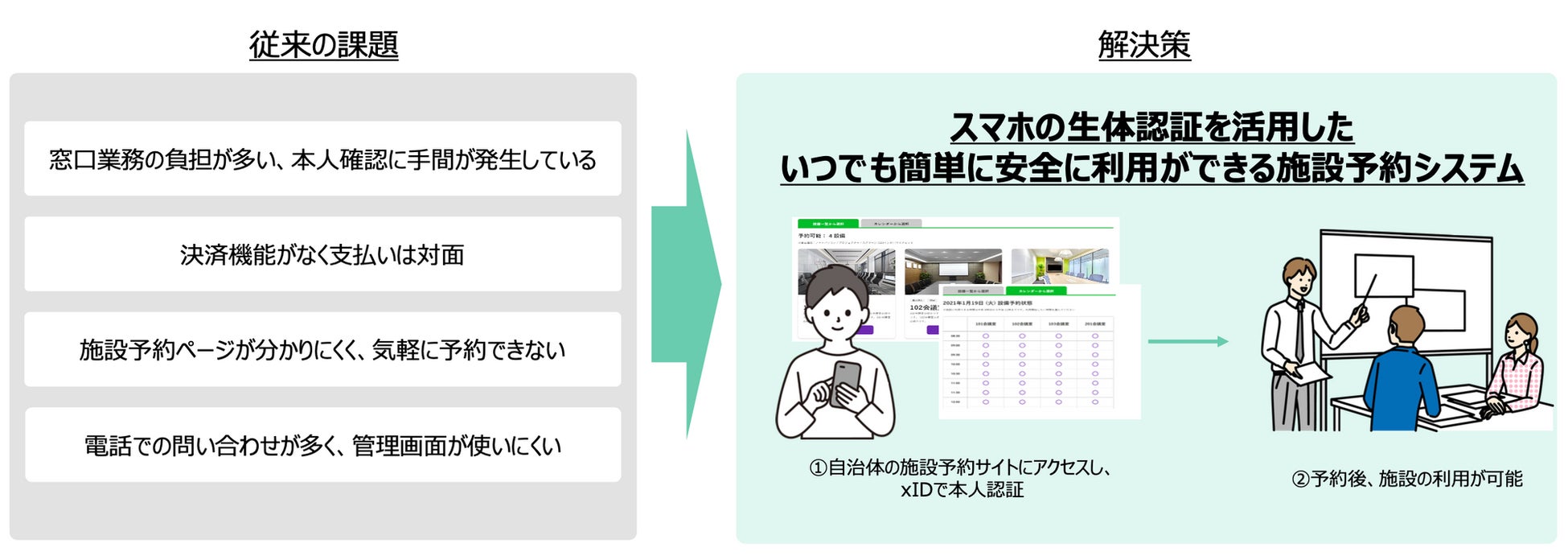 本サービスは従来の仕様要求から入札を行い、スクラッチ開発をする予約システムと違い、SaaS型の提供形式によって、あらかじめ用意された機能で住民と自治体が簡単かつ安価に利用が可能となります。住民向けの機能としては、オンラインでの利用登録やxIDと連携した本人確認が可能な他、スマートフォンのブラウザに対応したユーザーインターフェースやクレジットカード等、一般的なキャッシュレス決済に対応し、オンラインで予約を完結することができます。管理機能には、各自治体が管理する施設のオンライン登録や団体登録管理、予約状況データの集計を行うことができる他、公平性を担保するための予約結果の抽選機能等も付帯し、行政手続きのデジタル化の促進を図ります。