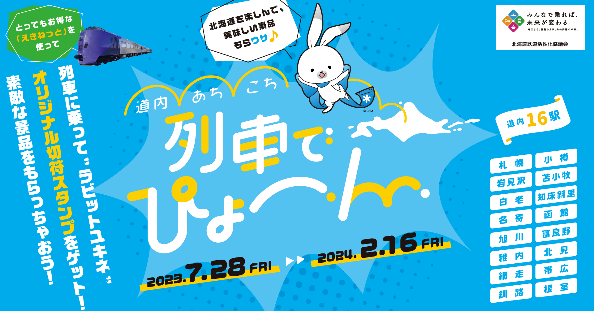 〇北海道鉄道活性化協議会では、道内鉄道網の利用促進を図るため、鉄道を利用した中・長距離移動を促進するキャンペーン「道内あちこち列車でぴょーん※」を7月28日から来年2月16日まで実施します。