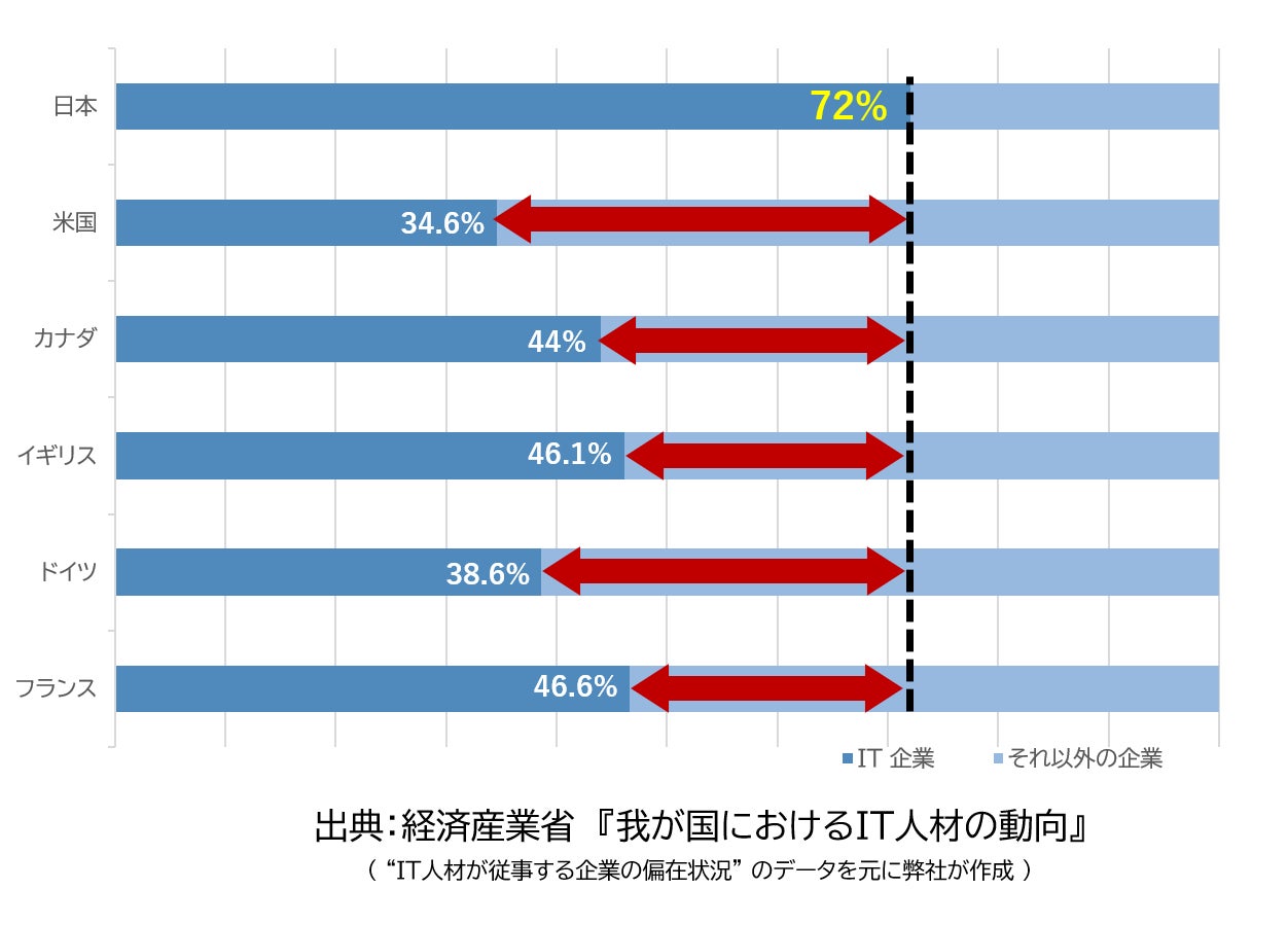 2021年に経済産業省から公開された『我が国におけるIT人材の動向』によると、日本の IT 人材は IT 関連企業に従事する割合が他の先進国と比較して非常に高く7割を超えています。これは、米国の 34.6% の2倍以上です。