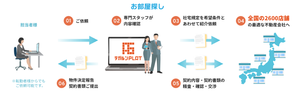 全国2600店舗の不動産会社と提携し、企業のお部屋探しをサポートします。総務人事ご担当者様か転勤者様のどちらかが、ご希望条件などのお部屋探しの情報を登録していただくことで、弊社提携の全国の不動産会社より、条件と貴社規定に沿ったお部屋をご紹介いたします。