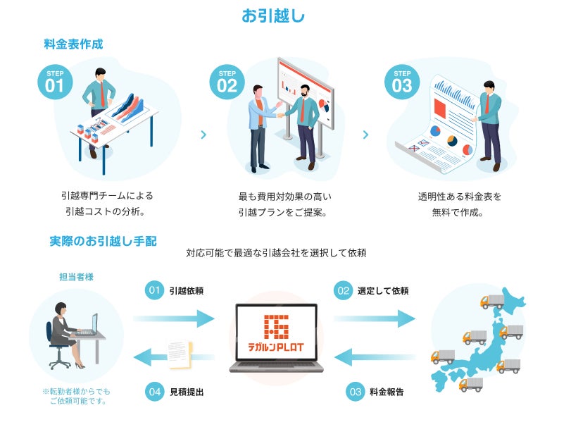 『テガルンPLAT』は転勤時のお部屋探しやお引越しをワンストップで対応。転勤時の手配業務に携わる総務人事ご担当者様の負担を最大80%軽減(※1)しつつ、引越しコストの削減も実現します。(※1当社調べ)