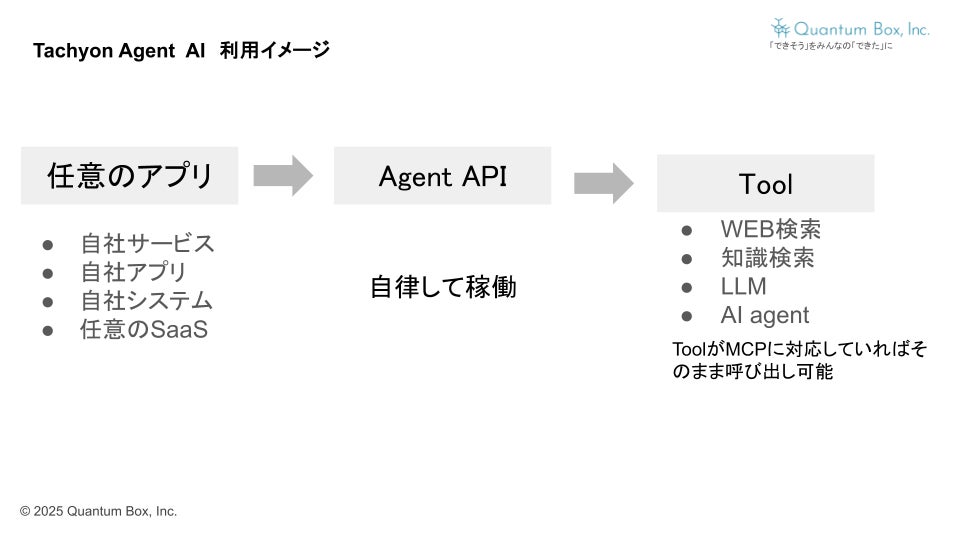 Quantum Box株式会社、MCP準拠の自律型AIエージェント開発基盤「Tachyon Agent API」を提供開始