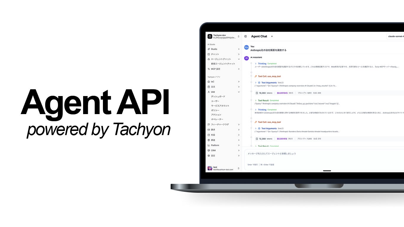 Quantum Box株式会社(本社:東京都渋谷区、代表取締役:福山貴徳)は、Model Context Protocol(MCP)に完全対応した自律型AIエージェント開発プラットフォーム「Tachyon Agent API」を正式に公開しました。本サービスはAIエージェントが自ら考え、学習し、設定されたゴールを達成するまでタスクを継続的に実行するもので、複雑なビジネスプロセスを完全自動化する新世代のAPIです。