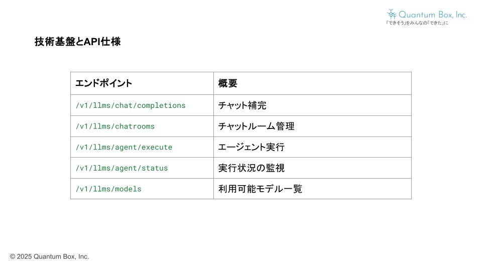 生成AIの普及により、単発の推論や文章生成を行うAPIは数多く登場しています。しかし、従来のAI APIは特定のタスクへの応答に留まり、長期的な目標達成や継続的な改善を自律的に行うことができませんでした。Quantum Boxでは「テクノロジーをみんなのものに」というビジョンのもと、業務効率化や人手不足の解消を目指して、実際に使える自律型AIエージェントの基盤を開発しました。