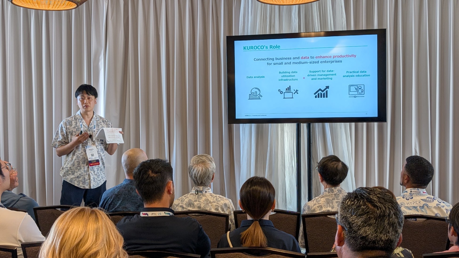 この”KUROCO支援”の功績が認められ、齋藤健太は、2025年1月19日から22日にかけてハワイで開催された国際会議であるPTC’25*の日本代表プレゼンテーターの一人に選出されました。各国のICT業界のリーダー、政府関係者、研究機関に向けてKUROCO支援の内容や実績を示し、世界市場における“KUROCO“の必要性を主張しました。PTC’25を通して齋藤は、AIをビジネスに活用する具体的な活用方法とAIが生み出す効果については海外企業も手探り状態であり、このフィールドにおいて日本企業が海外企業と戦える可能性や日本のスタートアップ企業への期待を十分に感じたと話します。