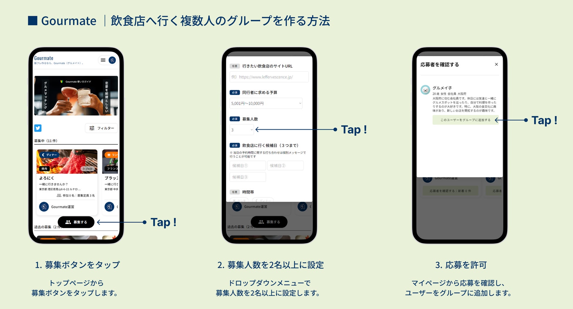 Gourmateは、「行きたい飲食店」「募集人数」「候補日」等を設定した募集を簡単に作成し、他のユーザーが応募ができる機能をベースに、より多くのグルメ好きの方々にご利用いただけるようサービス改善を続けていきます。