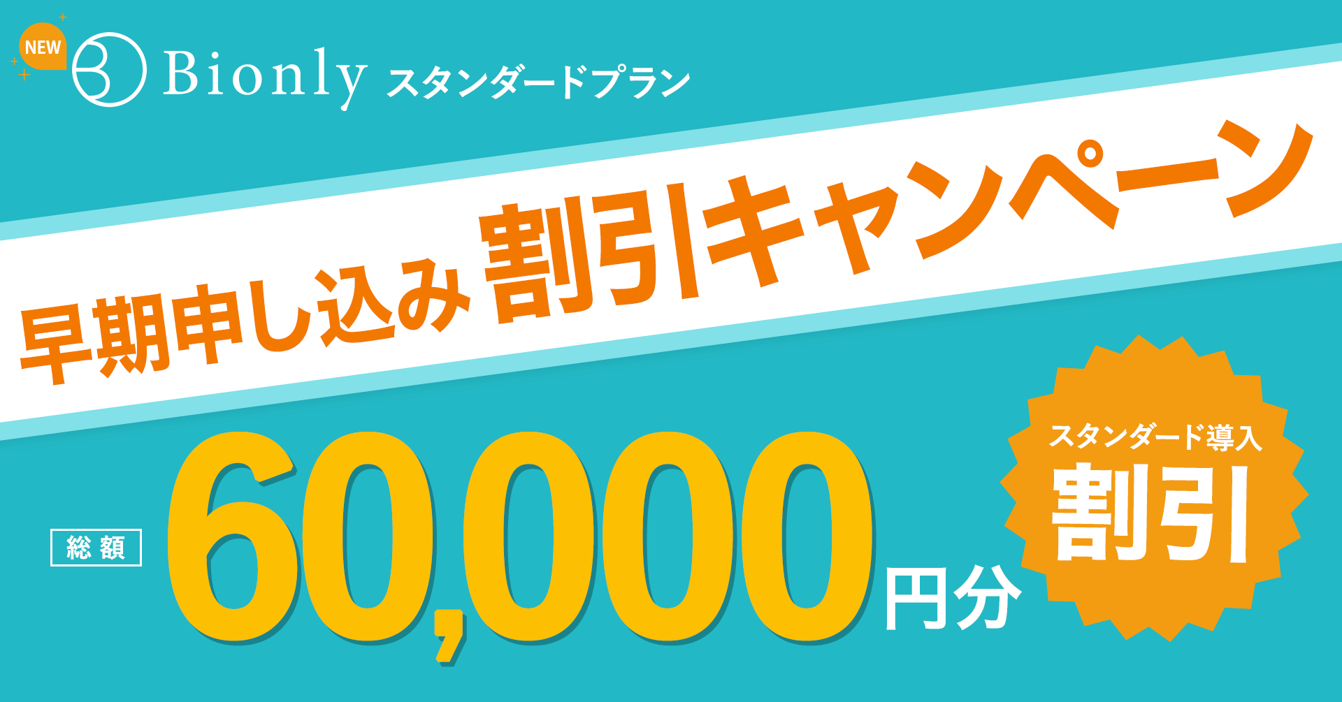 本日から11月初旬のサービス正式発表までの期間、特設キャンペーンページからエントリーいただいた方を対象に、New Bionlyサービス提供開始後スタンダードプラン(月契約/1年契約)を早期ご契約いただくと総額6万円分のスタンダード導入割引(1年間毎月5,000円割引)が適用となるキャンペーンを実施いたします。