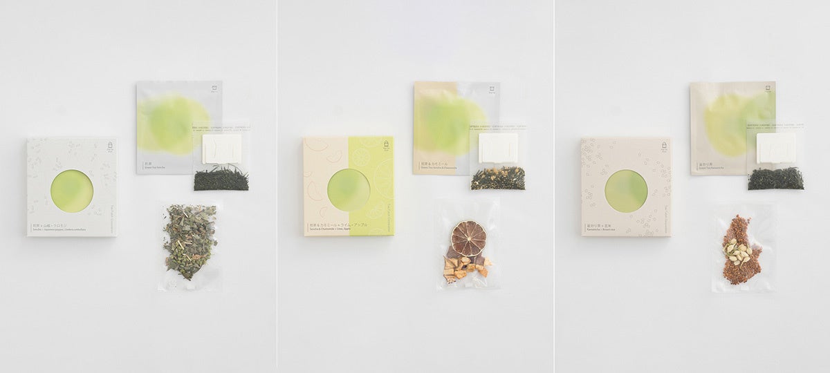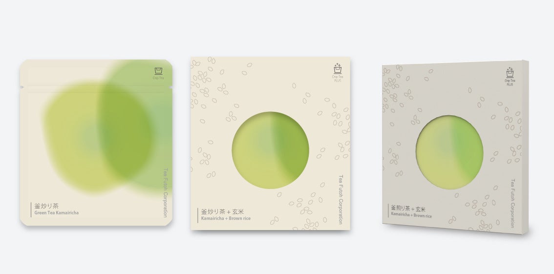中側の茶葉が入った袋はお茶のにじみや揺らぎによる時間の変化を、抽象絵画や日本的な「わびさび」の美的要素であると考えデザイン化されています。