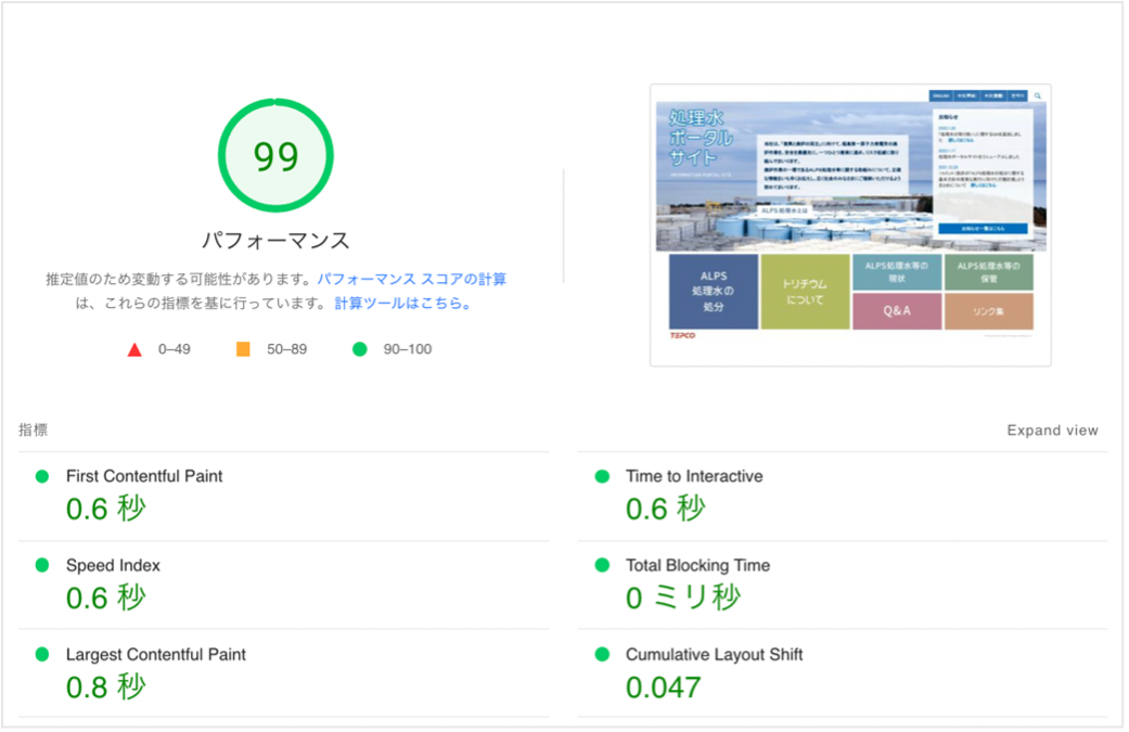 今回、ページを分割することで読み込み速度が大幅に上昇し、PageSpeed Insights(※1)でもスコア99と高いパフォーマンス結果となっております。