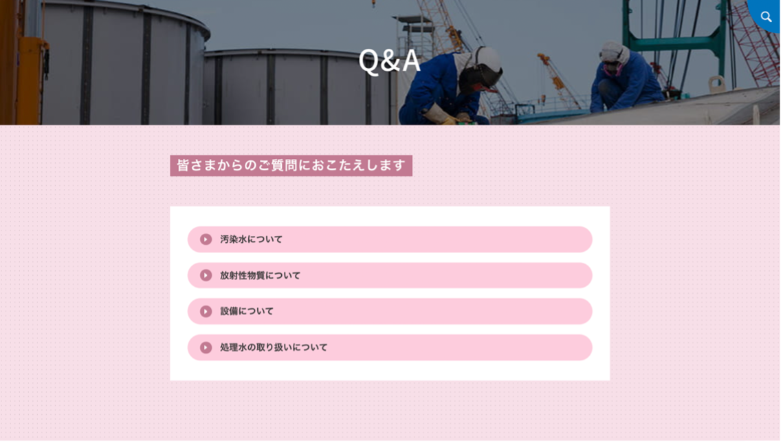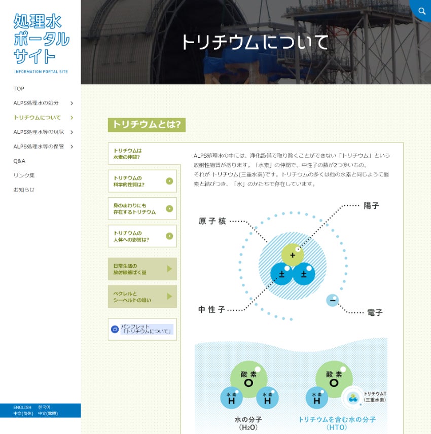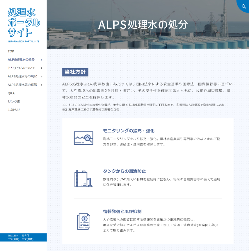 今回のリニューアルでは、ご利用いただくみなさまがより見やすく、また使いやすくすることを目的として、トップページをシンプルなデザインにリニューアルし、必要な情報へのアクセス性を向上しました。また、「ALPS処理⽔の処分」「トリチウムについて」などの新たな項目も追加し、情報の充実化を図りました。