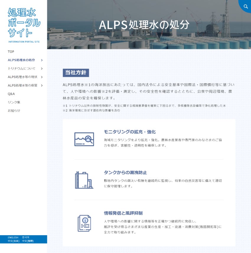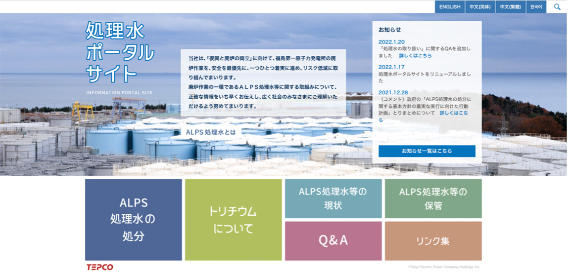 【東京電力ホールディングス株式会社】東京電力福島第一原子力発電所ALPS処理水等に関する「処理水ポータルサイト」をリニューアル