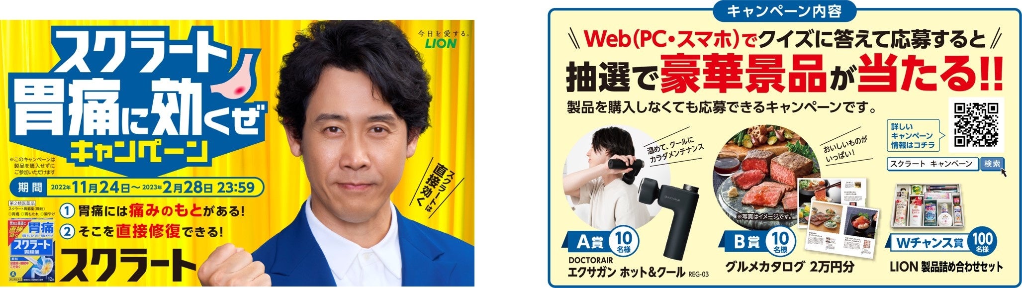 ライオン株式会社(本社:東京都墨田区)より発売中の胃痛のもととなる荒れた患部を直接修復する胃腸薬『スクラート胃腸薬』シリーズは、「スクラート胃痛に効くぜキャンペーン」(以下本キャンペーン)を2022年11月24日(木)より実施いたします。