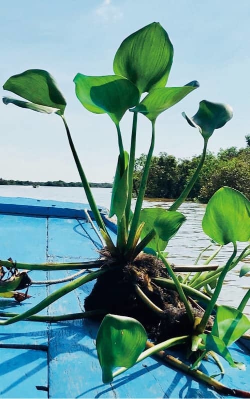 トンレサップ湖の水上村落チュノックトゥルー。見渡す限りホテイアオイが覆い尽くす。