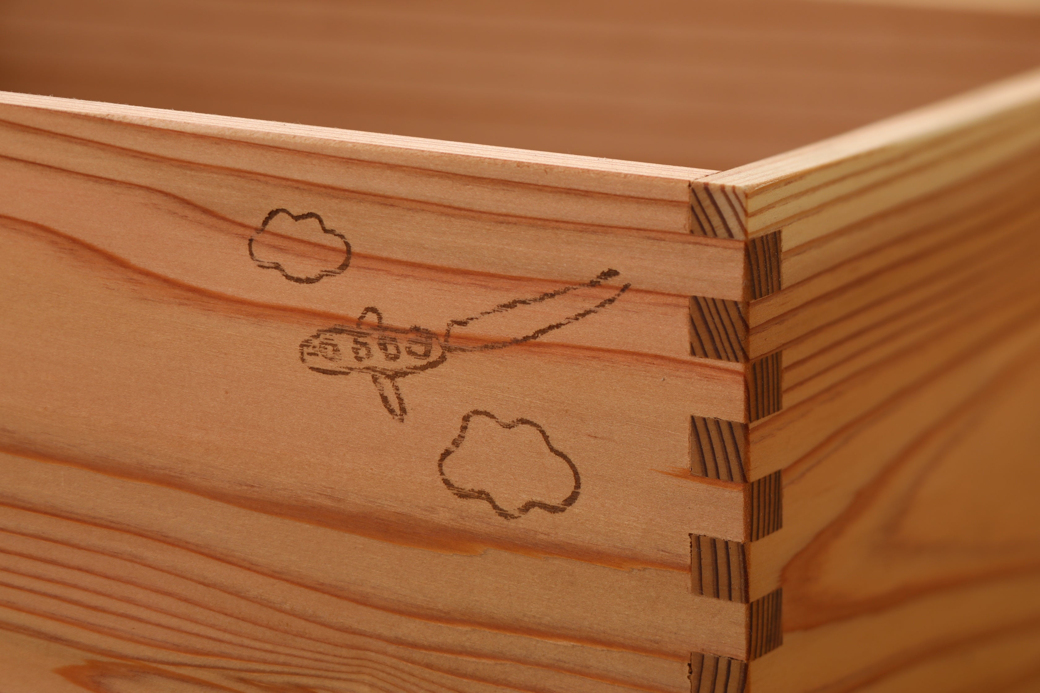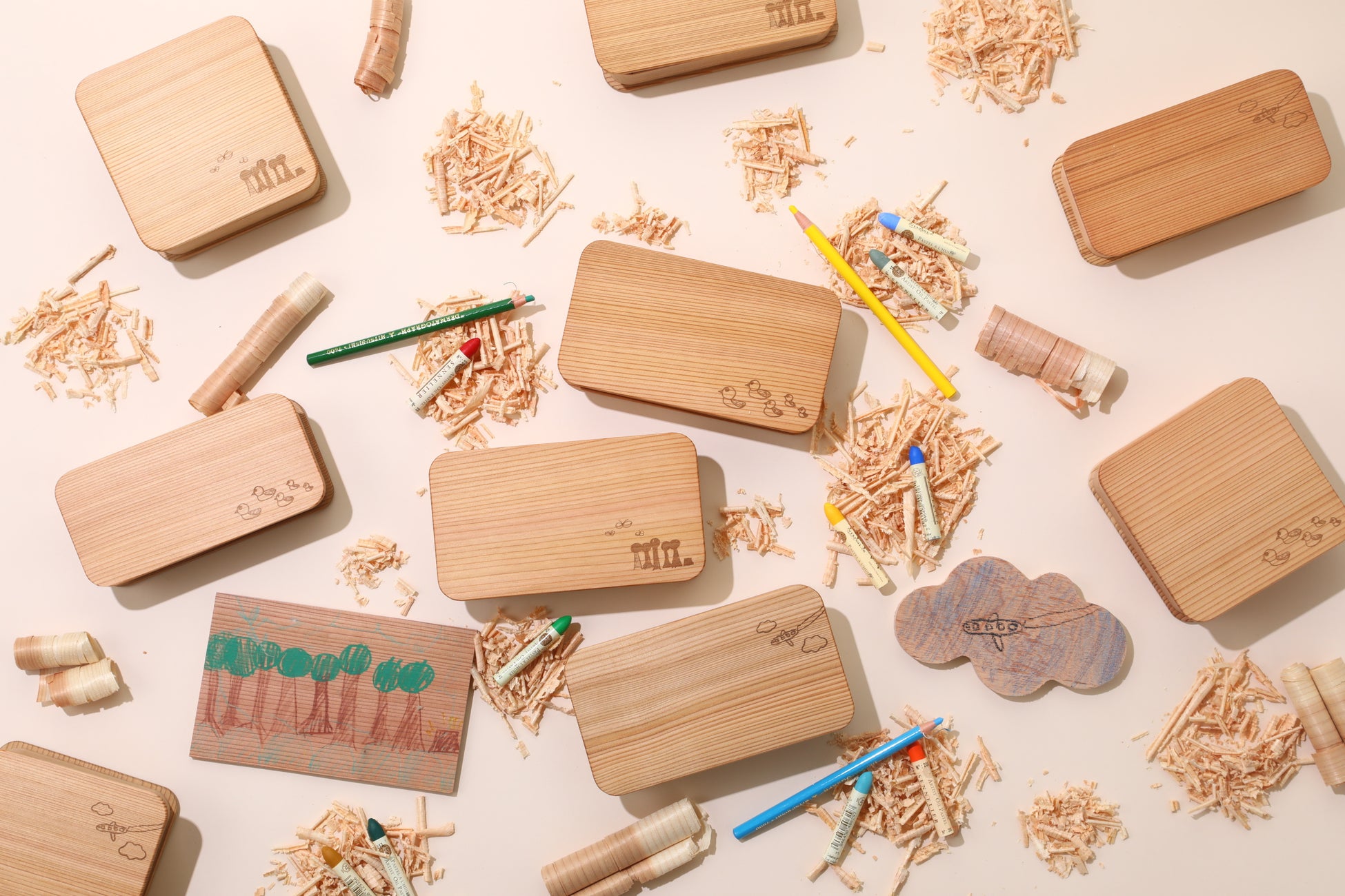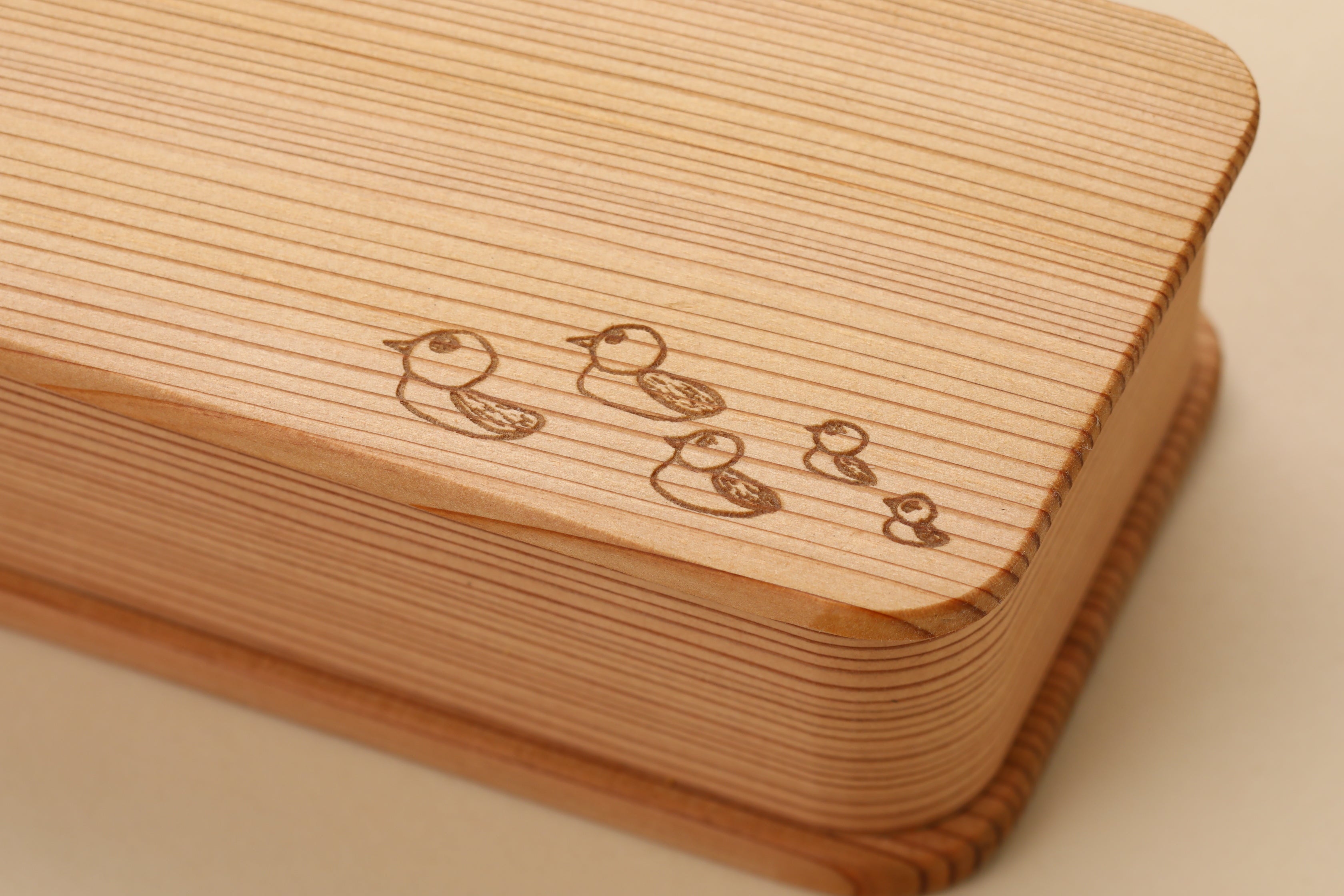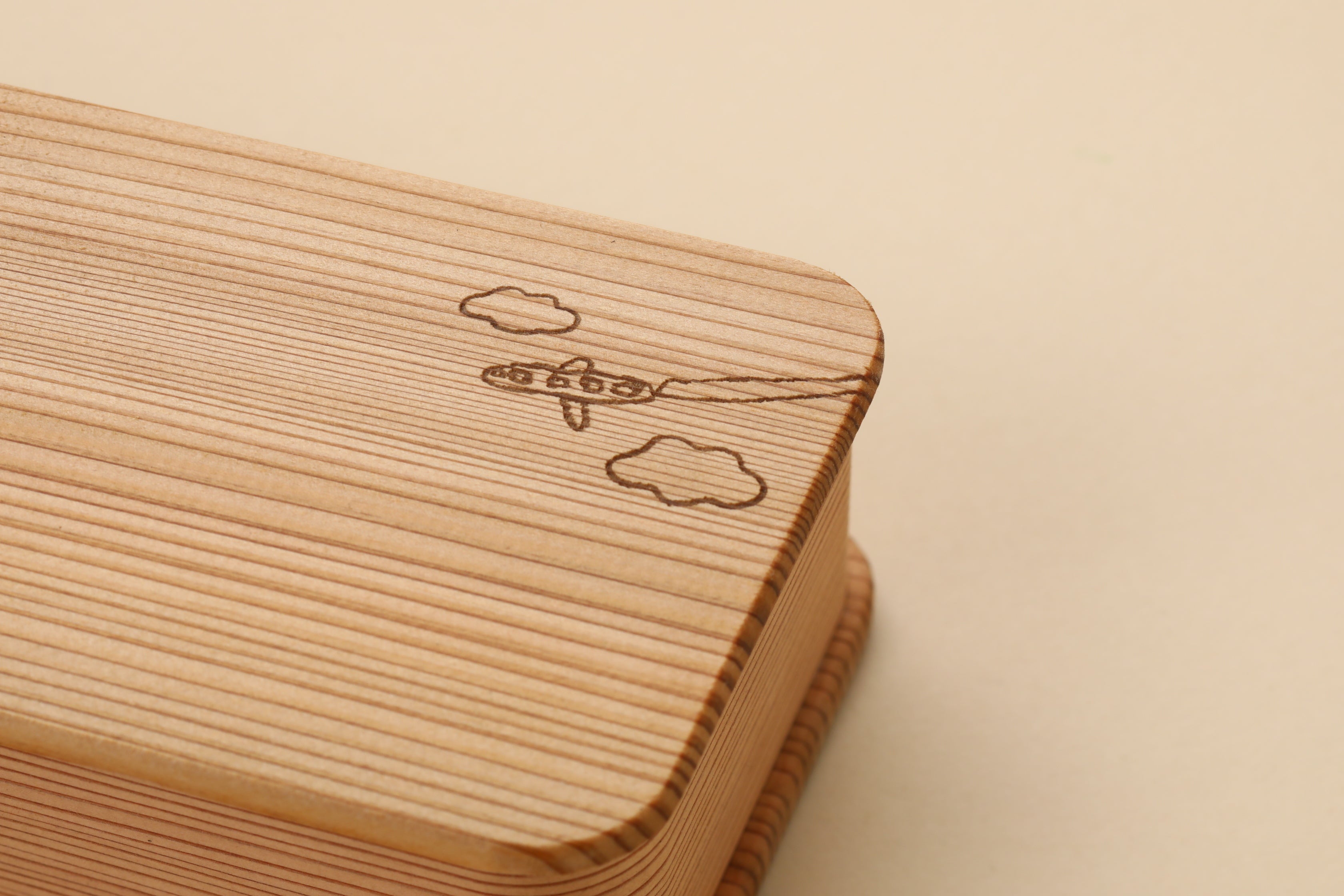 木箱職人が1つ1つ丁寧につくる”職人の手触り”と”木のぬくもり”。同じ木目は二つとない表情豊かな木箱に、子どもたちの”個性豊かな可愛らしい絵”がコラボレーションされた、世界にたった1つのお弁当箱です。