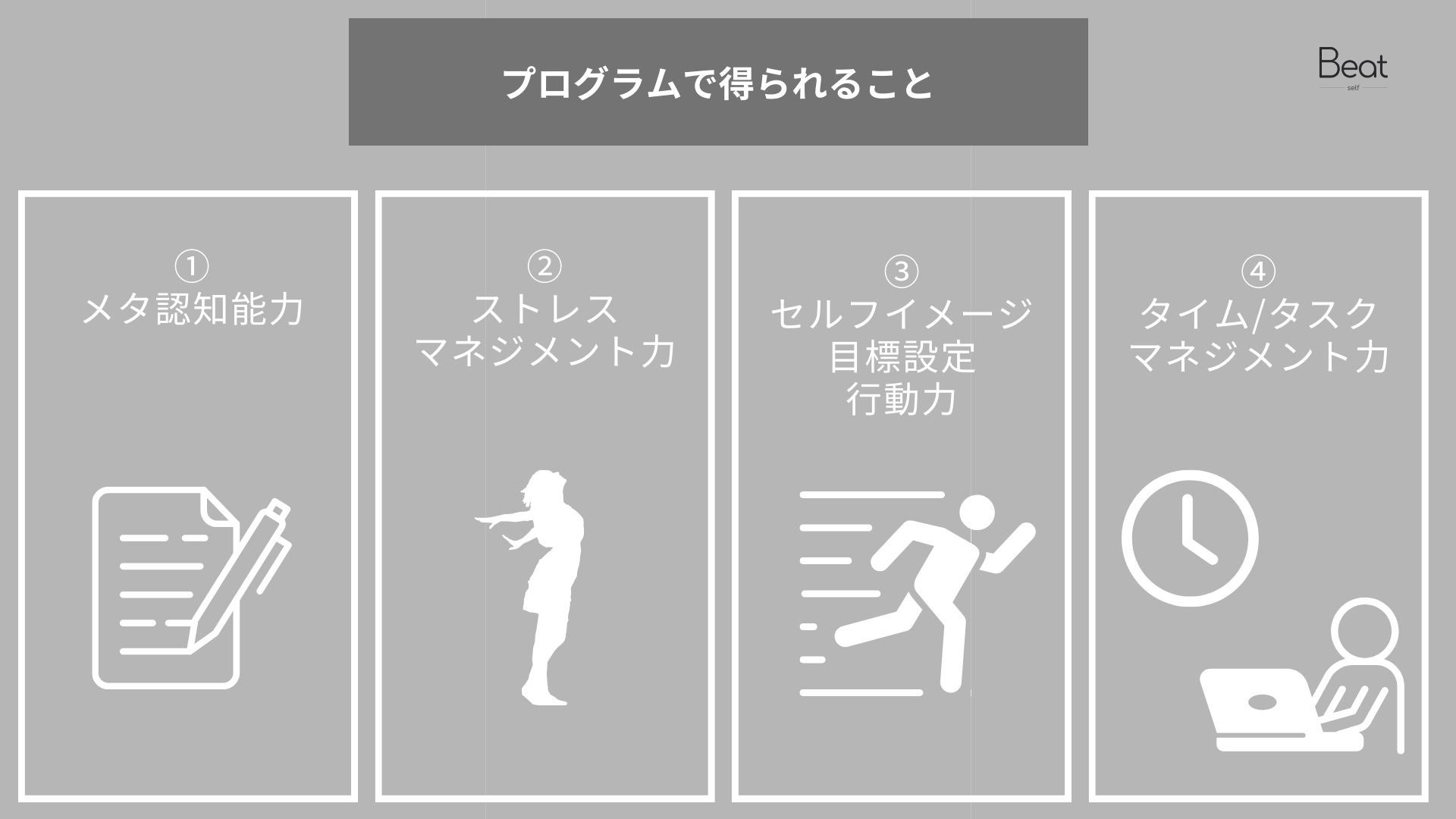 プログラムで得られることは、主に4つです。これら全てが、連動していくことで、持続可能な力を発揮できる、セルフマネジメントができると考えています。