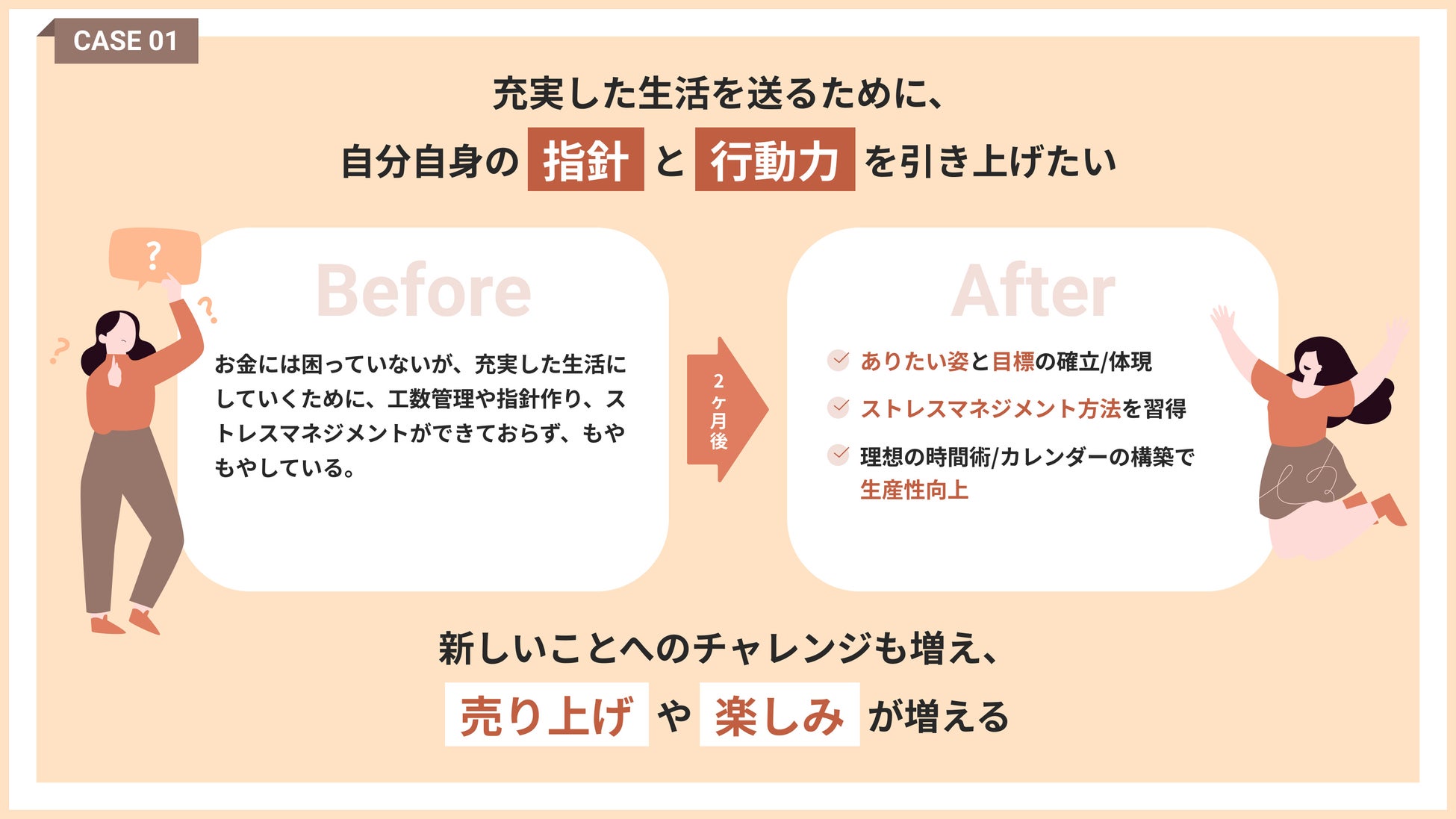 メソッドをただ教わるだけではありません。コーチとのセッションや性格診断ツールを使ったワークを通して、目標設定、ストレスマネジメント、行動化を実践し、「自分自身の生活に合わせた」セルフマネジメントの仕方に昇華できます。