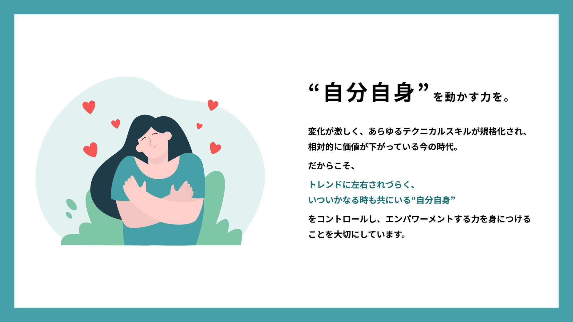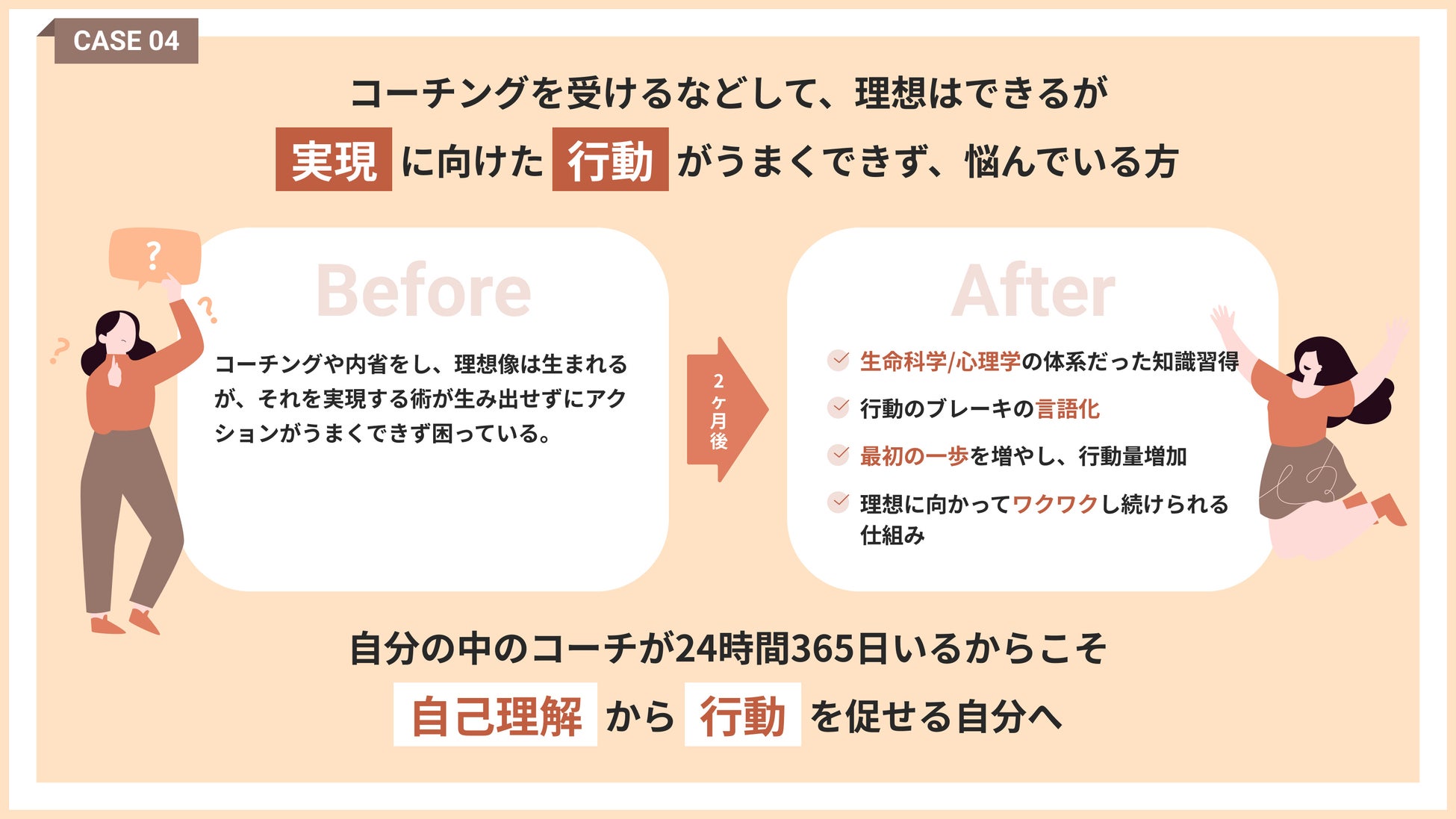「専門的なスキルを養うスクールで知識を手に入れても、十分に活用することができない」「コーチングセッションでワクワクした気持ちになっても、その状態が長く持続しない」という声をよくお聞きします。本プログラムでは、どんな専門的なスキルを手にするにせよ必要となる”自分自身をコントロールする力”を養い、目標を実現するための実践力を身につけるノウハウをお届けしています。そのため、プログラム終了後でも継続して学びを活かしていただくことができます。