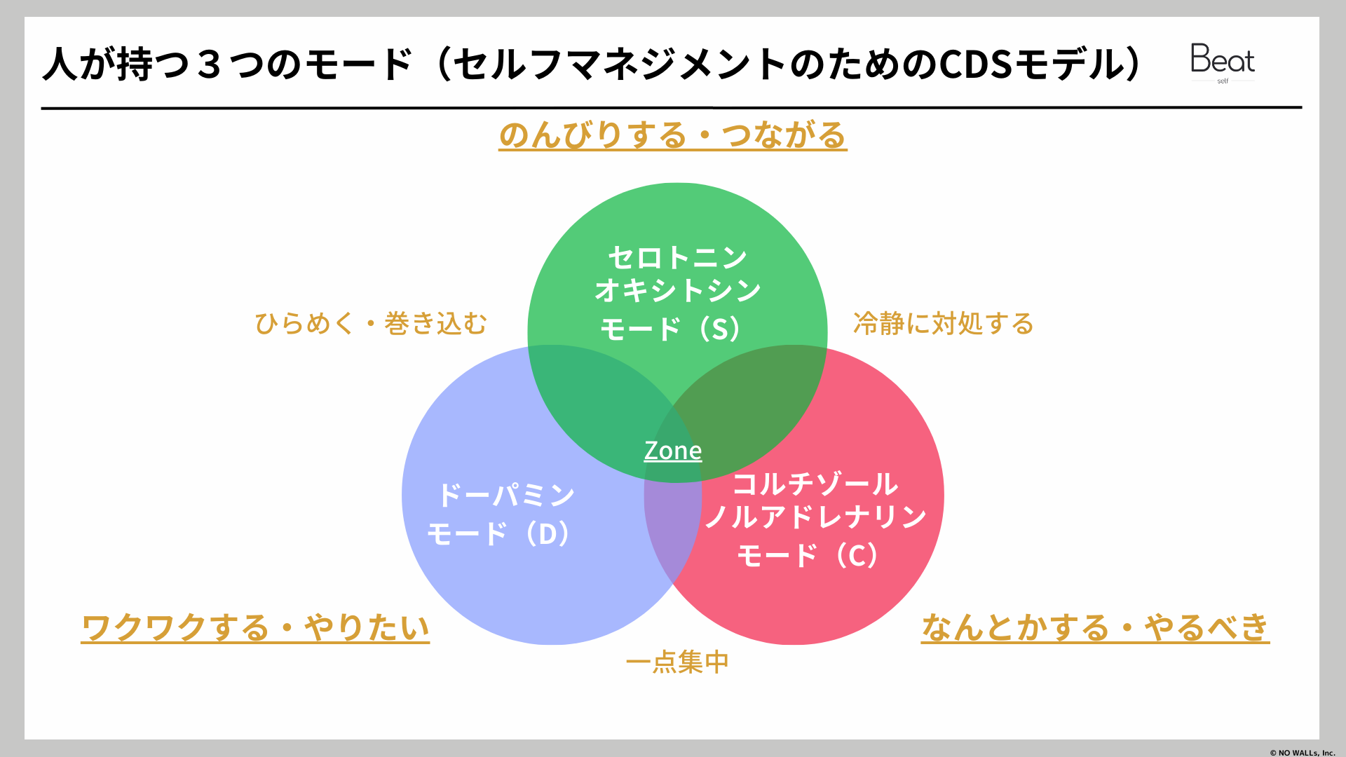 続いて、穏やかな気持ちで落ち着いて物事に対処できる「Sモード」へと変化させることを意識します。シチュエーションに応じて、ワクワク感や集中力を高める「Dモード」への移行を促すことも可能です。