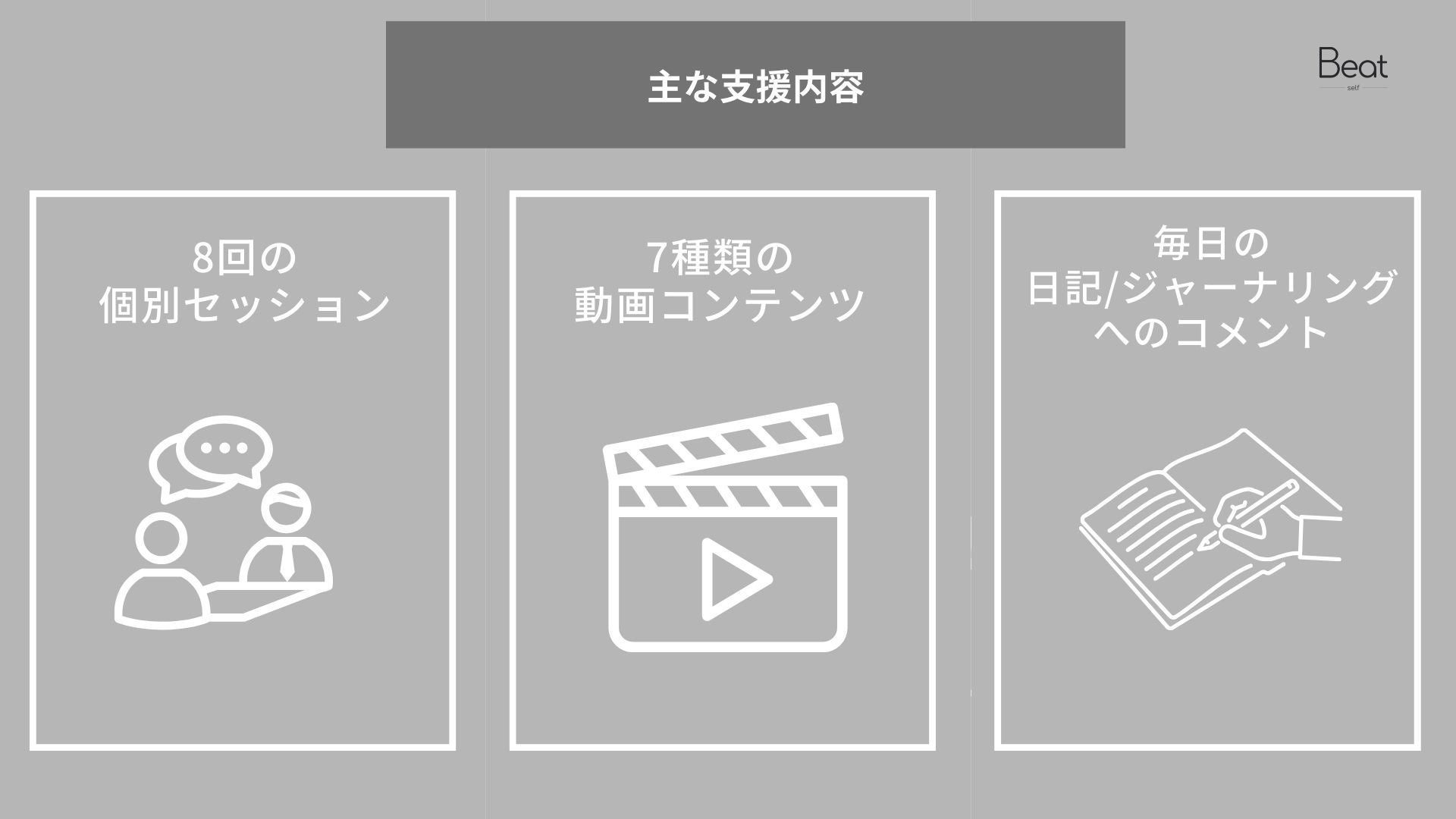 とはいえ、セルフマネジメントを体系的に学ぶ機会は学校や会社でもなかなかなく、自己流や属人的なノウハウに止まってしまいがちな現状があります。再現性の高い科学的なノウハウを、丁寧な伴走によって個々人の特性に合わせて落とし込んでいく。「Beat」が、一人ひとりが生きやすく、豊かな日々を送るための頼もしい土台であり続けられるよう、プログラムを磨き続けていきたいと考えています。