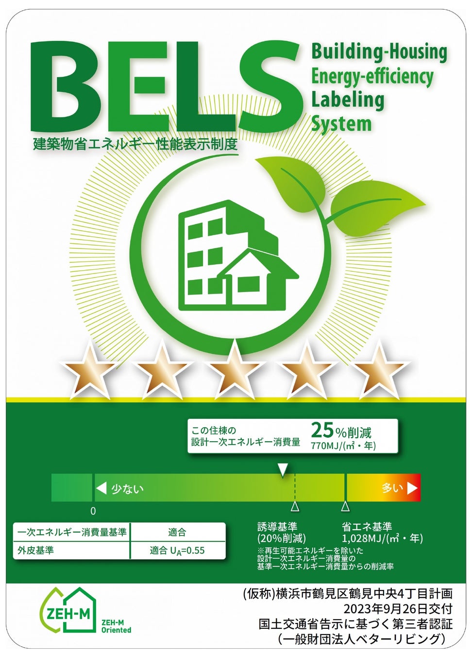 BELS(Building-Housing Energy-efficiency Labeling System)とは、建築物省エネルギー性能表示制度の略称で、省エネルギー性能に特化した評価・表示制度です。建築物の一次エネルギー消費量に基づきBELS評価機関が5段階で評価し、省エネルギー性能を表示する制度となります。
