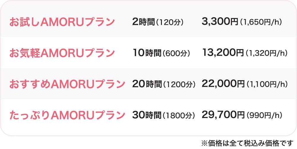 | 料金 | 1時間あたり990円(税込)〜 詳しくはこちら(https://www.amoru.love/) |