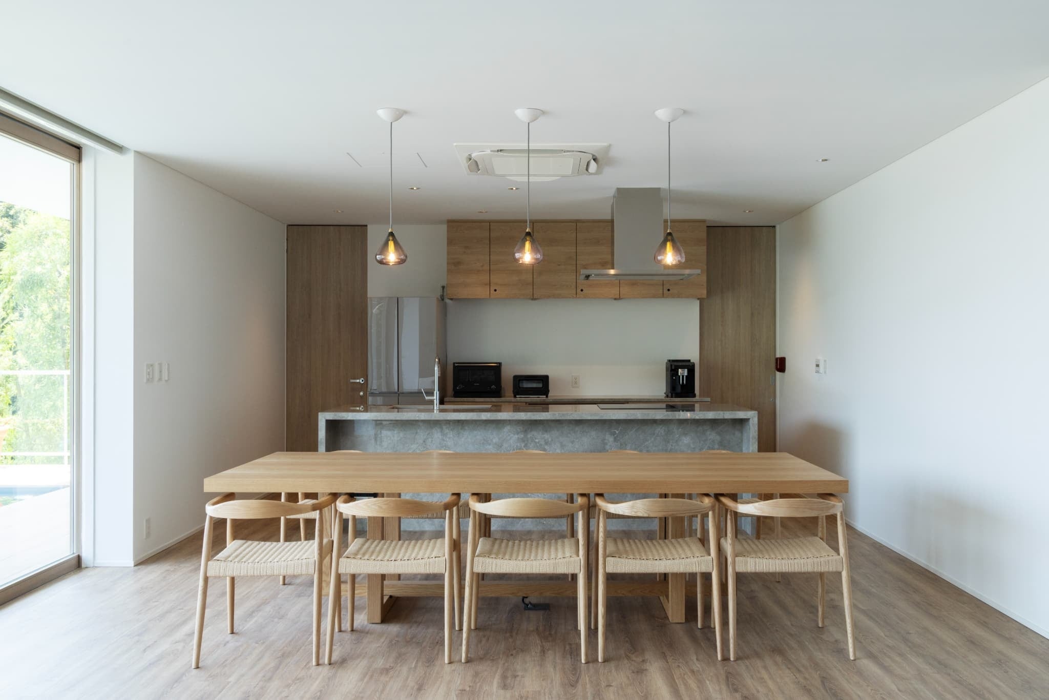 リビングから続くインフィニティプールを介して、熱海の豊かな緑、蒼い大空、青い海といった自然とつながる、心に安らぎを感じられるデザインを目指しました。